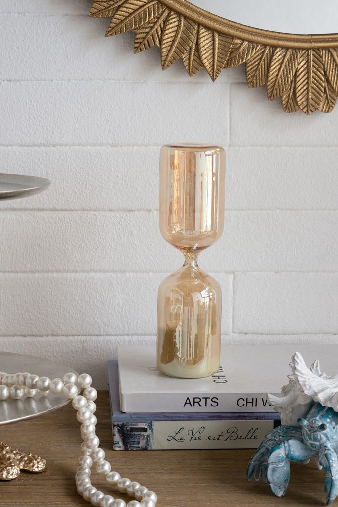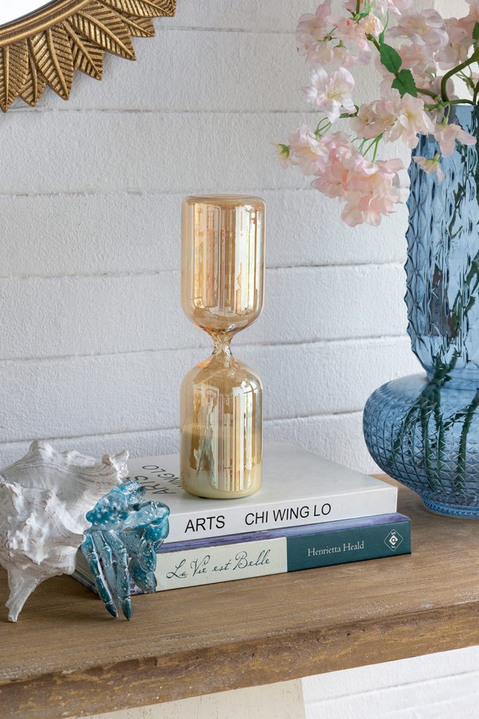 Reimagining the classic two-bulb hourglass as a modern statement, this piece features a slender, rounded silhouette, a warm amber finish, and tranquil white sand. Standing 10 tall, it is perfectly sized for a tabletop, desk, or mantel, drawing the eye whether displayed alone or paired with a refined ensemble.