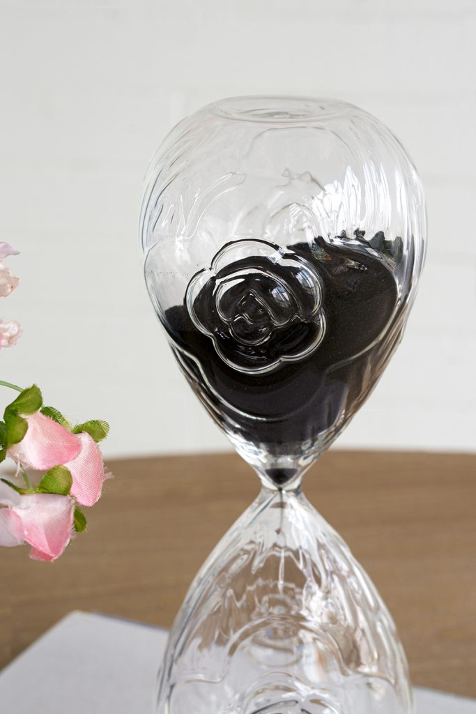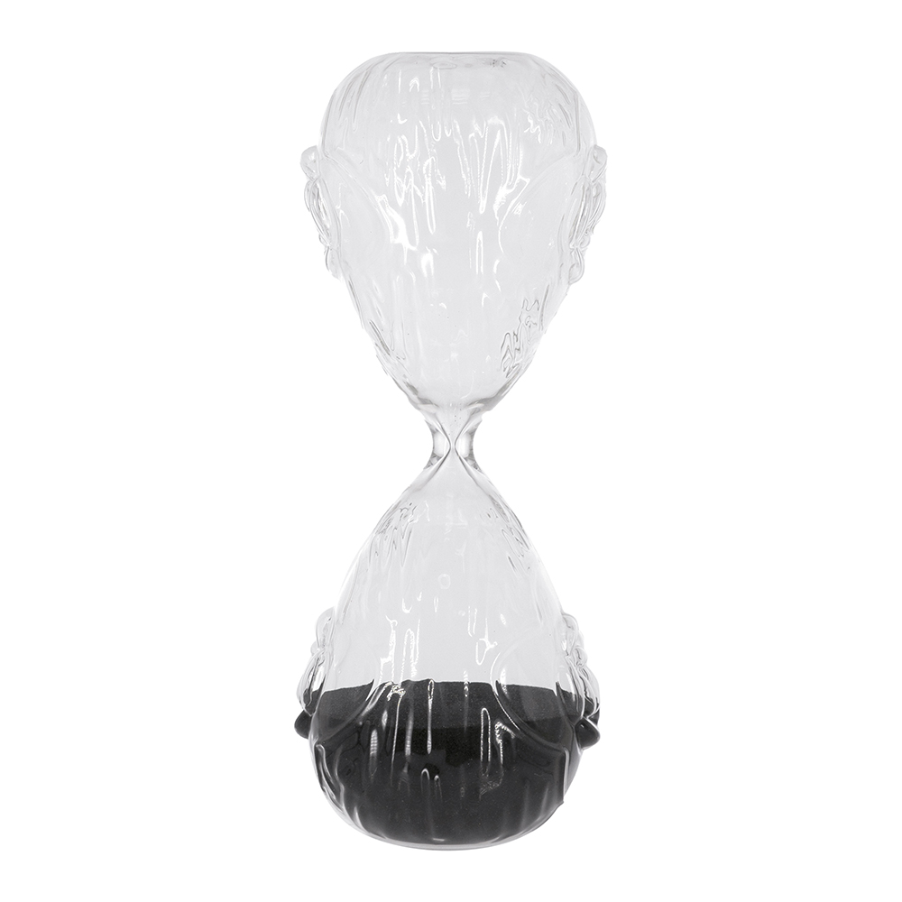 Blending the effortless charm of nature with classic design, this hourglass features two clear, curved bulbs, contrasting black sand, and an embossed rose motif that adds a touch of romantic allure. Standing 10 tall, it is perfectly sized for a tabletop, desk, or mantel, drawing the eye whether displayed alone or paired with a refined ensemble.