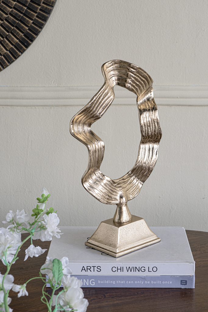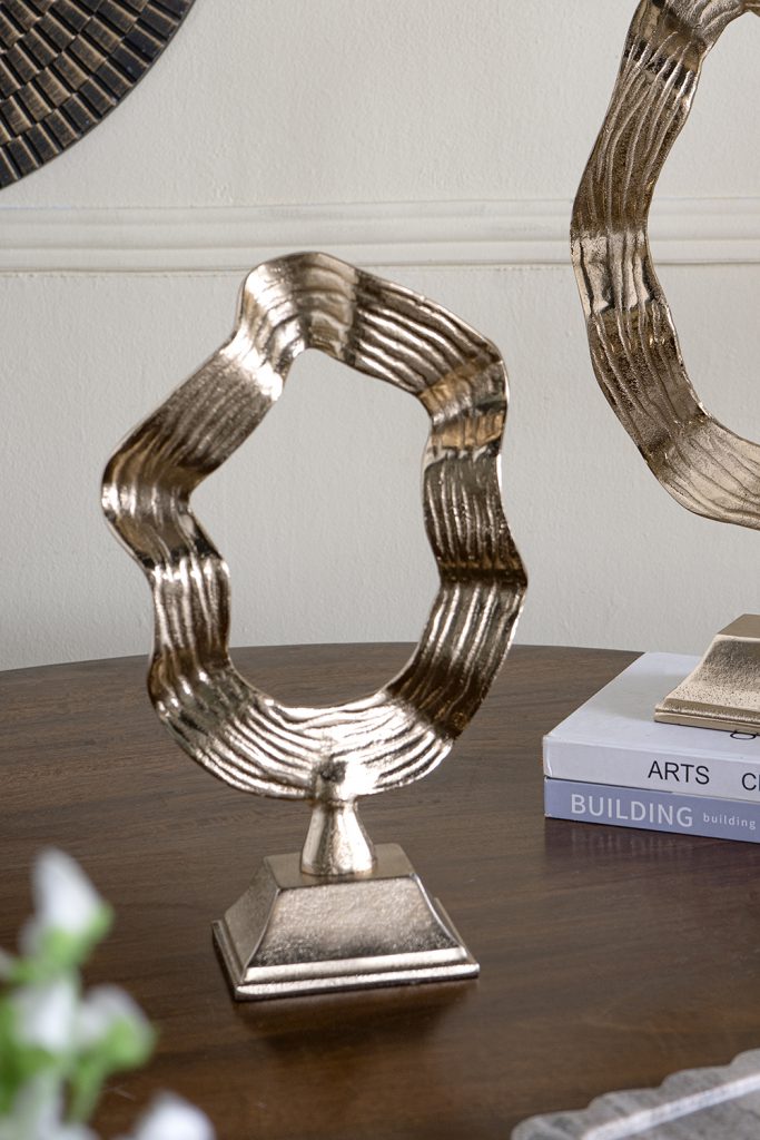 Featuring a fluid, interconnected loop design, a textured gold finish, and a sturdy pedestal base, this decorative sculpture showcases the beauty of abstract art. Whether displayed individually or as part of a bold centerpiece, it will fit perfectly on any tabletop, mantel, dresser, or sideboard.
