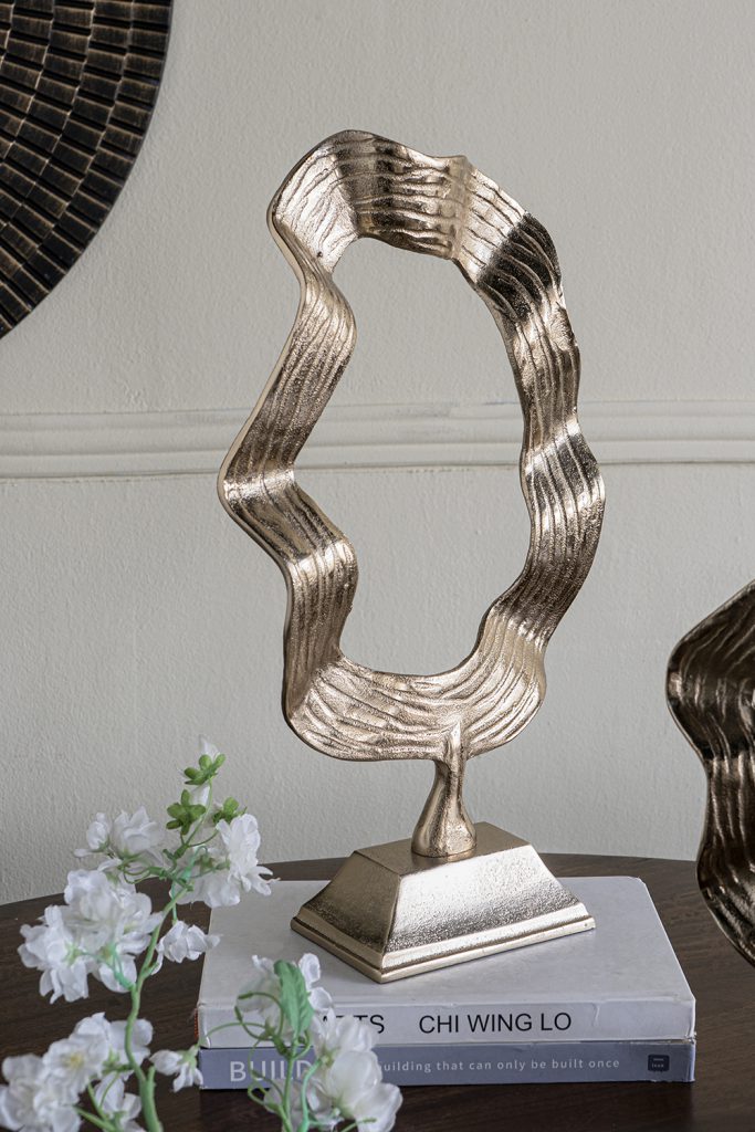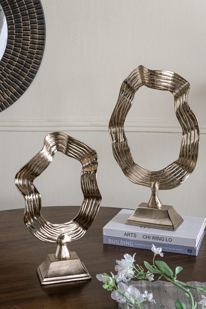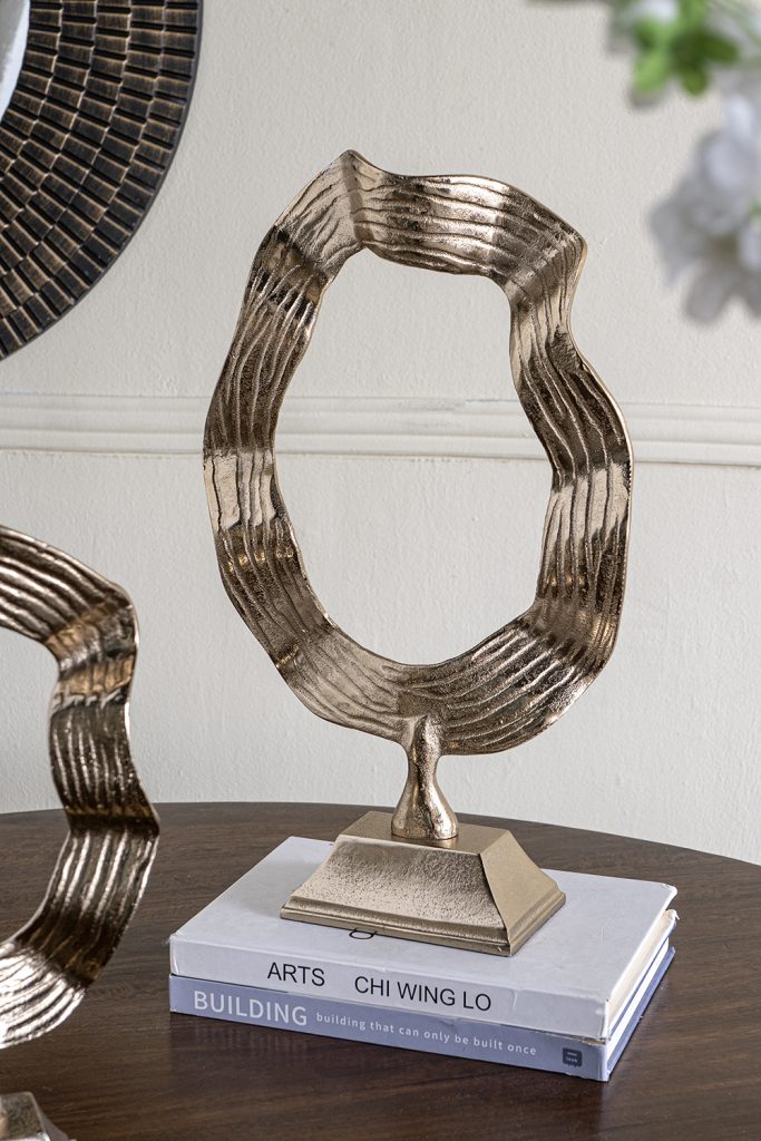 Featuring a fluid, interconnected loop design, a textured gold finish, and a sturdy pedestal base, this decorative sculpture showcases the beauty of abstract art. Whether displayed individually or as part of a bold centerpiece, it will fit perfectly on any tabletop, mantel, dresser, or sideboard.