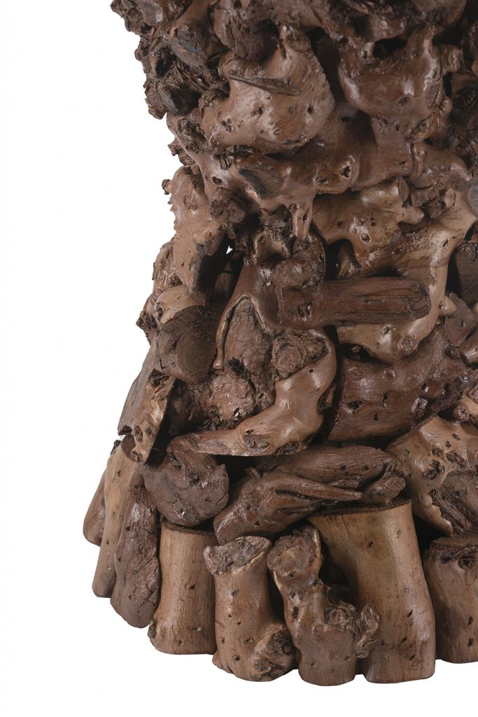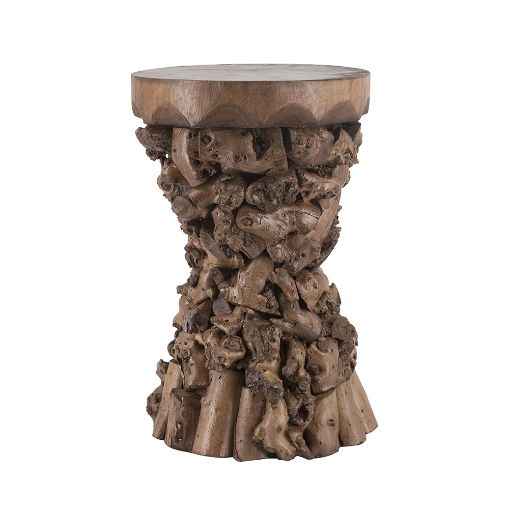 Classic design meets organic charm in this decorative side table. Featuring an hourglass-inspired silhouette, a warm brown finish, and a natural tree root texture, it is sure to draw the eye whether used as an end table, display pedestal, or nightstand.