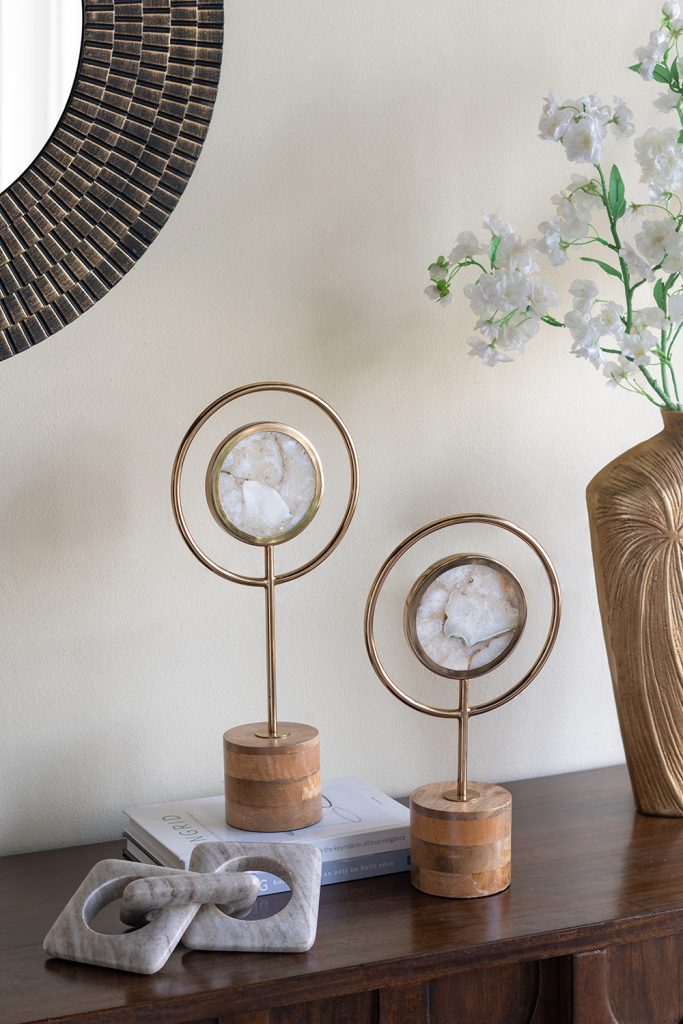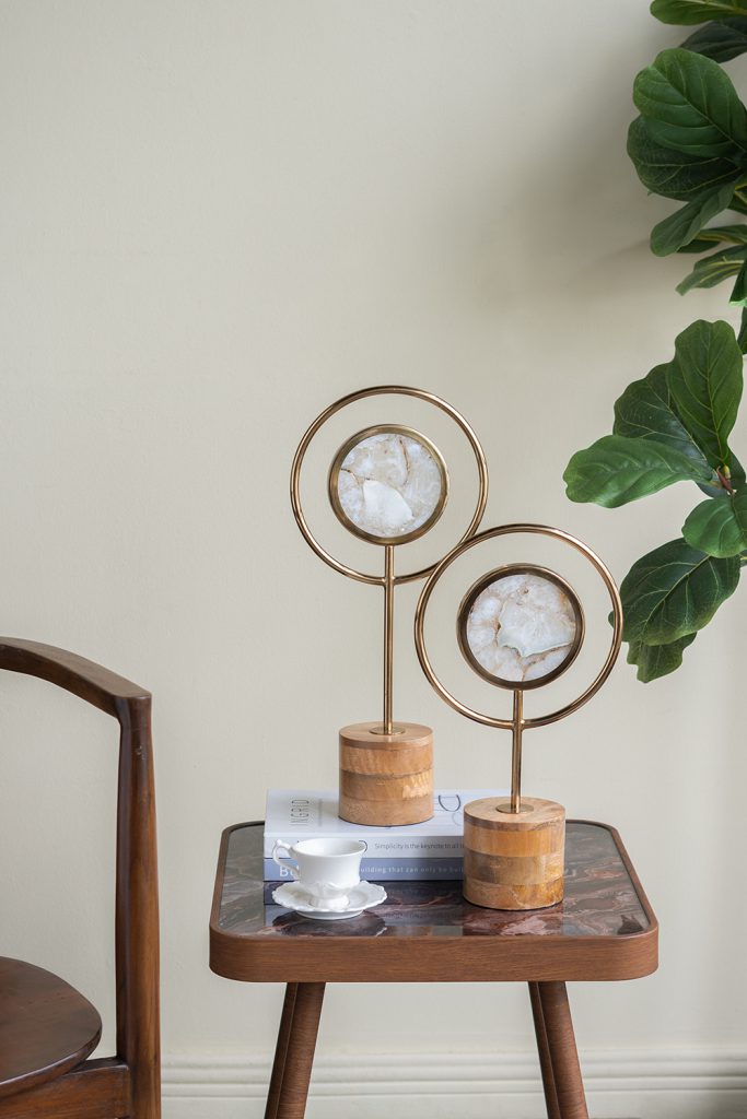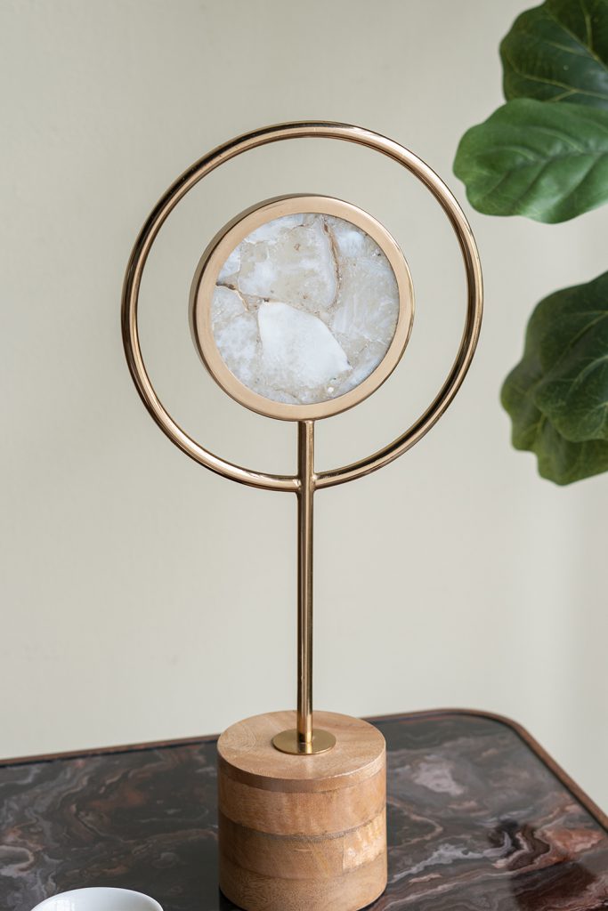 Showcasing the timeless beauty of natural materials, this sculpture features a slice of authentic white agate, framed in a ring of slender gold iron. Set atop a grained wooden base, it is certain to infuse any living room, entryway, or bedroom with a pop of organic charm.