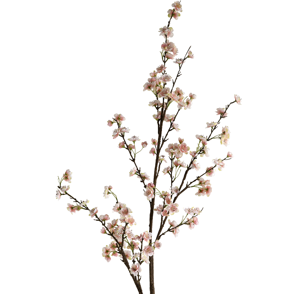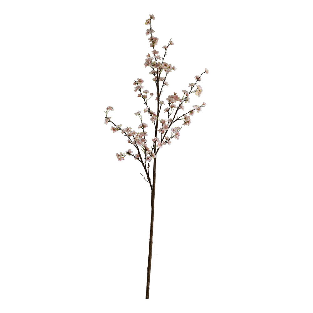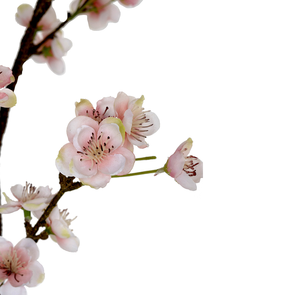 Infuse your space with springtime beauty using this faux pink cherry blossom branch. Soft, clustered pink blooms with yellow centers on a realistic brown stem mimic fresh cherry blossoms. 60 inches tall, ideal for vases, centerpieces, or accents, bringing serene elegance. Maintenance-free for enduring charm.
