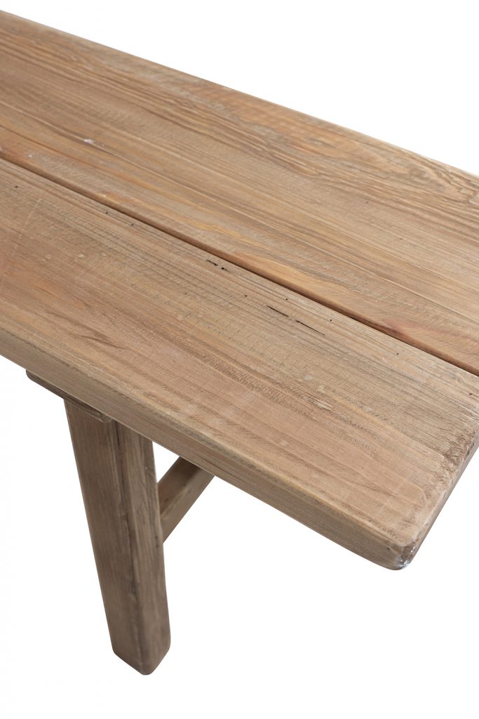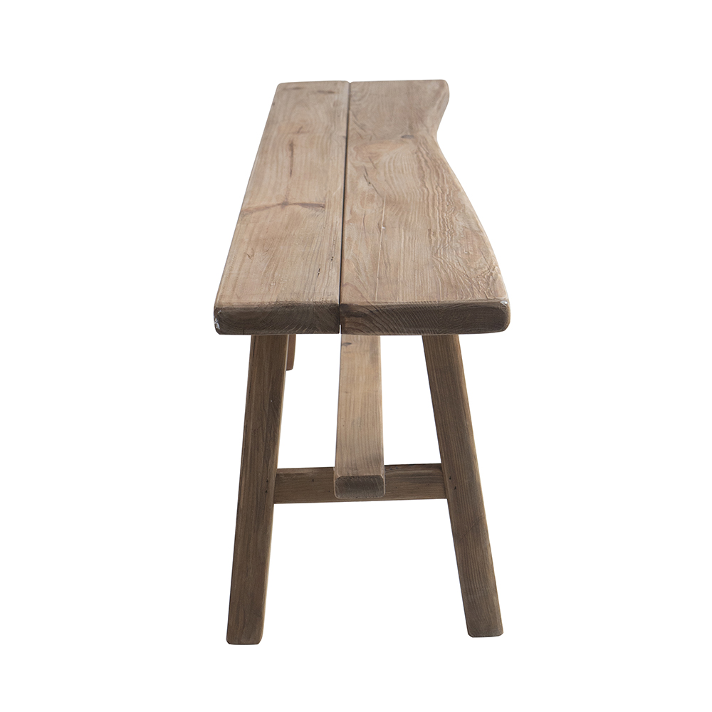 Drawing inspiration from the cozy charm of vintage countryside homes, this bench features a long rectangular top, a natural brown finish, and sturdy angled legs joined by a central stretcher bar. Crafted from 100% recycled pine wood, it offers exceptional durability and distinctive grain patterns, making it a striking yet functional addition to any mudroom, dining area, or covered patio.