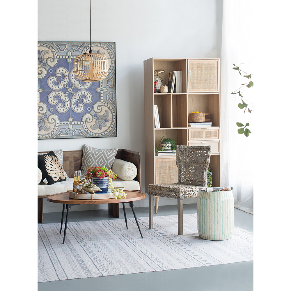 A tall bookshelf with multiple shelves and clean lines will always have a place in your home. The natural finish ensures the natural beauty of wood comes through the mixed material construction. Ideal for transitional spaces, it looks best in the living room or office.