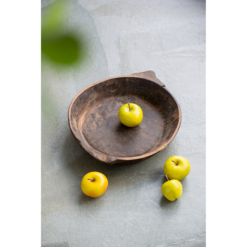 This antique wooden parrat with handles is a medium-sized decorative bowl, finished for a rustic appeal. With two solid handles, it offers a smart look on kitchen islands. Custom crafted to highlight its natural texture, this farmhouse-style bowl brings a transitional twist. Made from reclaimed antique wood, each piece is unique with variations in size, shape, and color.