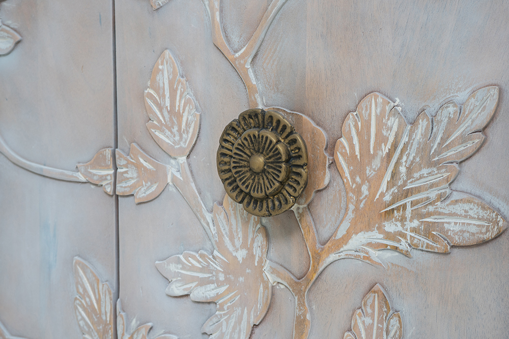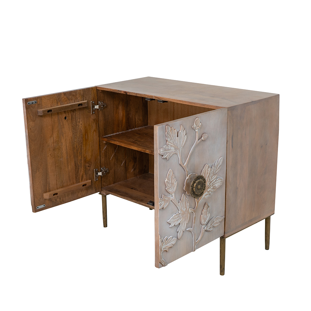 Capturing the delicate beauty of nature, this cabinet features a sleek two-door design, alluring floral patterns, and a blend of warm brown, soft white, and antique gold tones. As versatile as it is stylish, it is perfectly sized for any living room, bedroom, entryway, or office, making an immediate impression in any space.