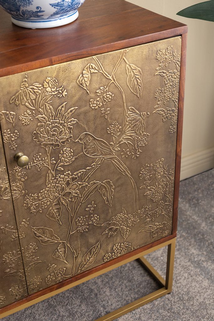 Combining the rugged allure of nature with airy minimalism, this cabinet features a clean silhouette with two textured doors, a deep grained brown finish, and a slender, gold-finished metal frame. As versatile as it is stylish, it is perfectly sized for any living room, bedroom, entryway, or office, making an immediate impression in any space.