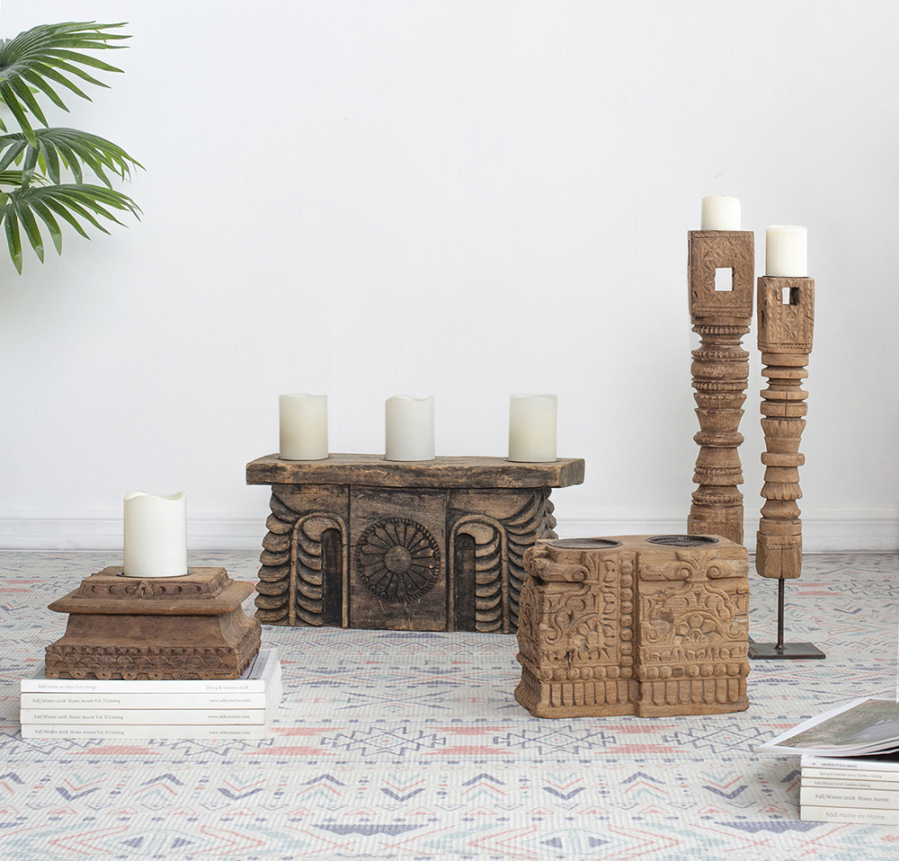 Inspired by traditional design, this antique carved pillar candle holder brings a timeless touch to any tabletop. Made from rustic distressed wood and metal, it highlights the pillar candle as the focal point. A refined accent for the modern home, each piece is crafted from reclaimed antique wood, making it one-of-a-kind with unique variations in size, shape, and color.