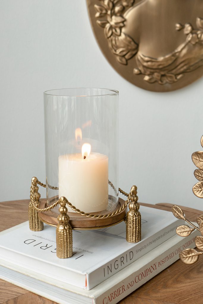 Inspired by the opulence of classic Rococo art, this candle holder features a clear cylindrical hurricane, an intricately detailed tassel-style base, and a warm antique gold finish. Whether displayed alone or added to a refined ensemble, it casts a soft, ambient glow throughout the room when paired with a pillar or LED candle.