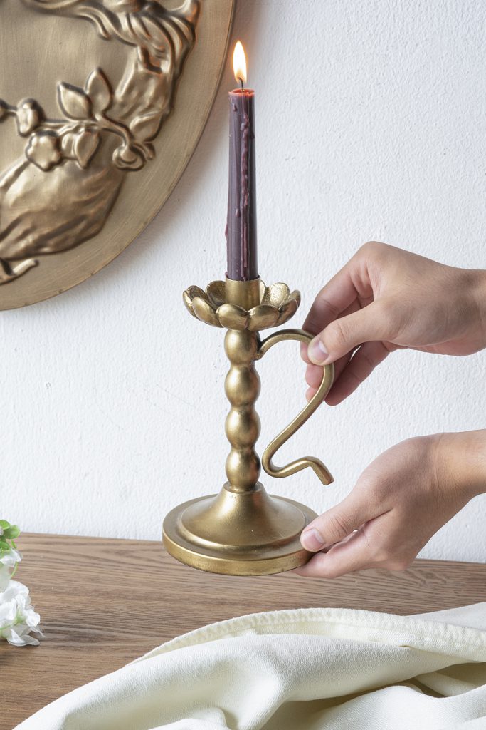 Inspired by the refined allure of vintage European design, this candlestick features a slender ribbed body, a scalloped lotus flower cup, and a playful, swooping handle. Finished in rich metallic gold, it captures the eye whether displayed alone or paired with a taper candle to cast a warm, soothing glow throughout any space.