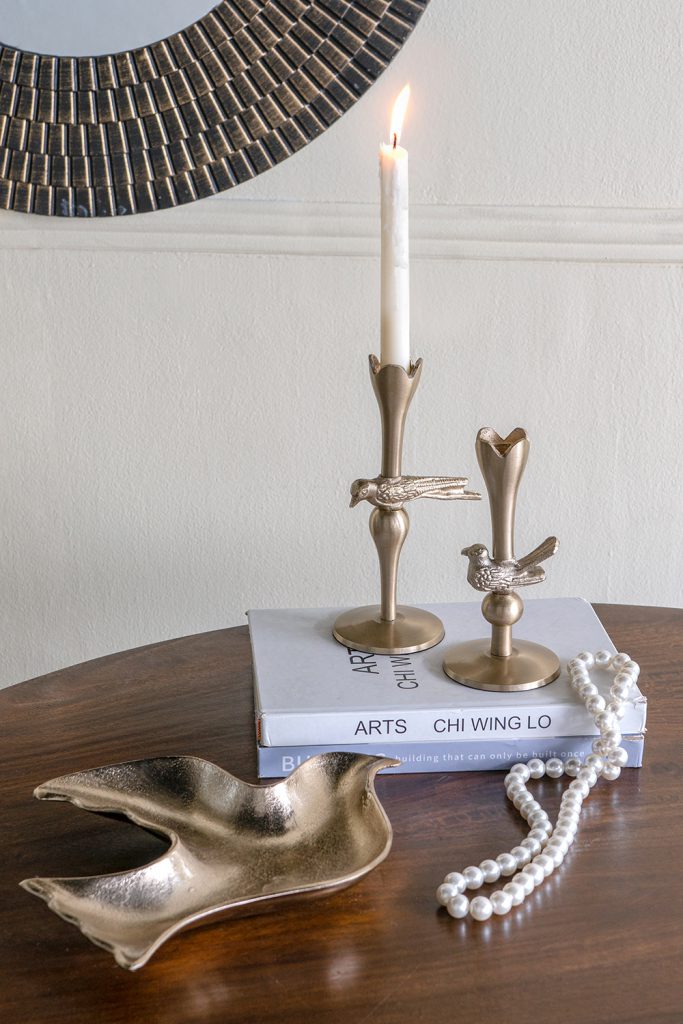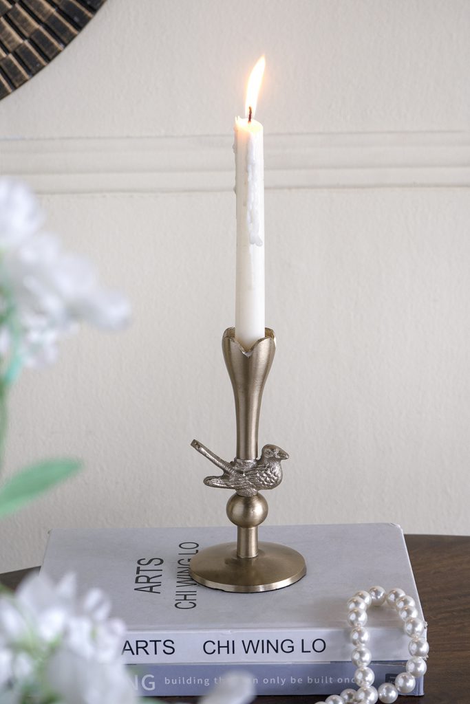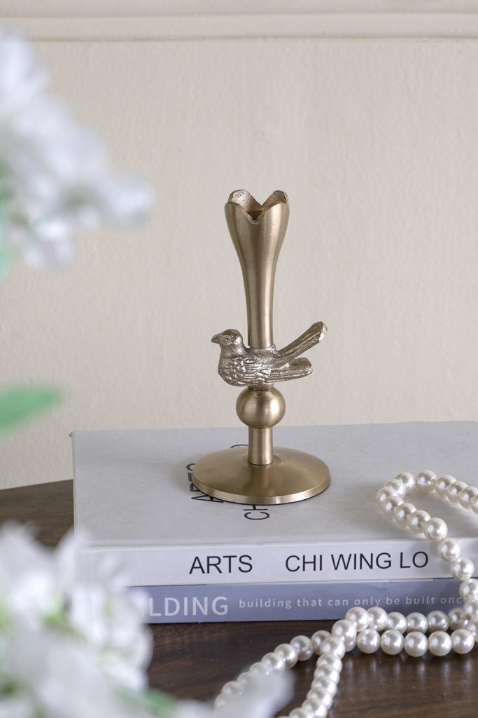 Seamlessly blending abstract art with the effortless charm of nature, this candlestick features a slender, tulip-inspired design adorned with a playful bird at its center. Finished in antique gold, it captures the eye whether displayed alone or paired with a candle to cast a warm glow throughout any room.