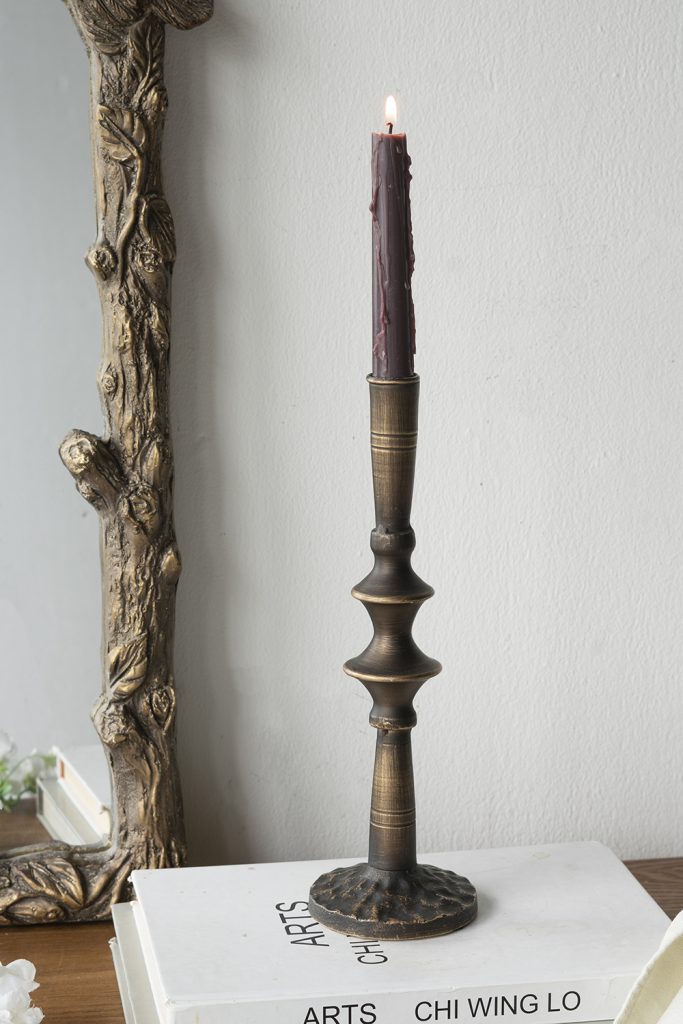 The old-world design and intricate curved details allow this candlestick to complement traditional, rustic, farmhouse, and industrial themes, ensuring it can slot into any setting seamlessly
