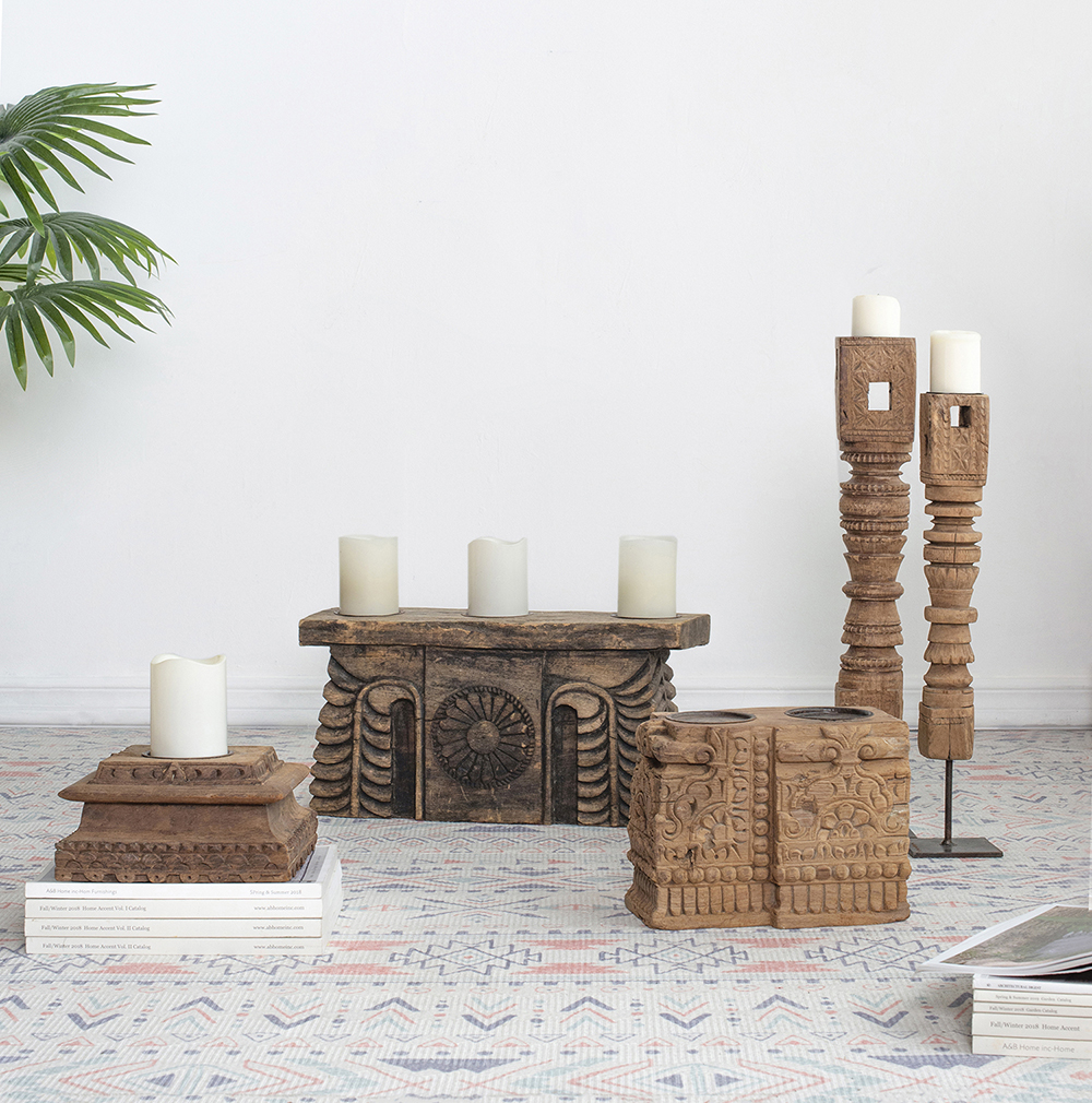 This small antique carved pillar candle holder features a tall design with a square metal base for rustic charm. Ideal for a transitional home, it holds a single candle with style. Its gray finish and elegant detailing make it a versatile accent for various spaces. Crafted from reclaimed antique wood, each piece is unique with variations in size, shape, and color.