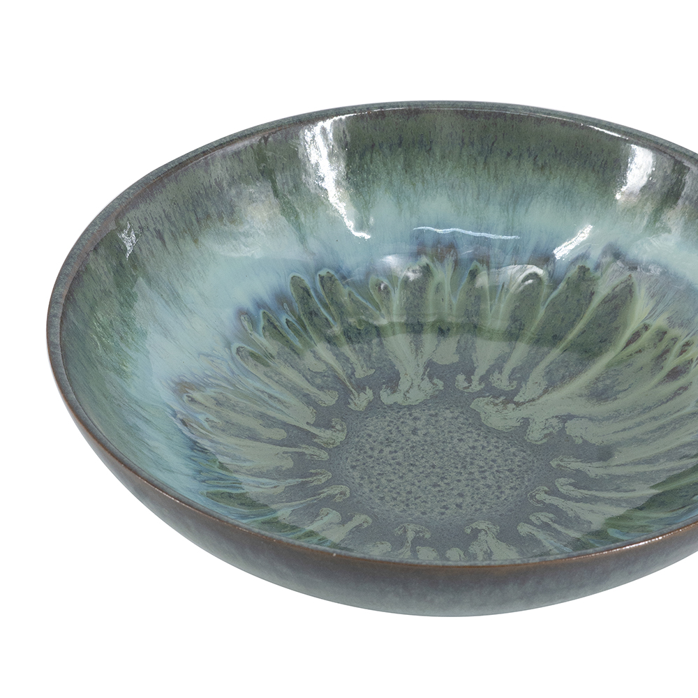 Drawing inspiration from the fluid beauty of the ocean, this ceramic bowl features a sculptural silhouette and a reactive glaze that flows through layered shades of blue. Perfectly sized to serve as an entryway catchall, standalone accent, or centerpiece pedestal, it adds a touch of earthy charm to any space.