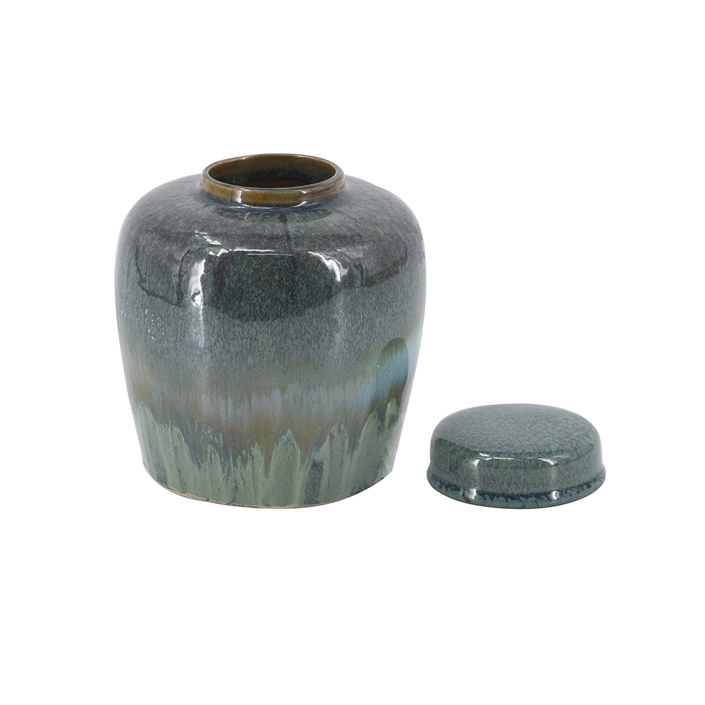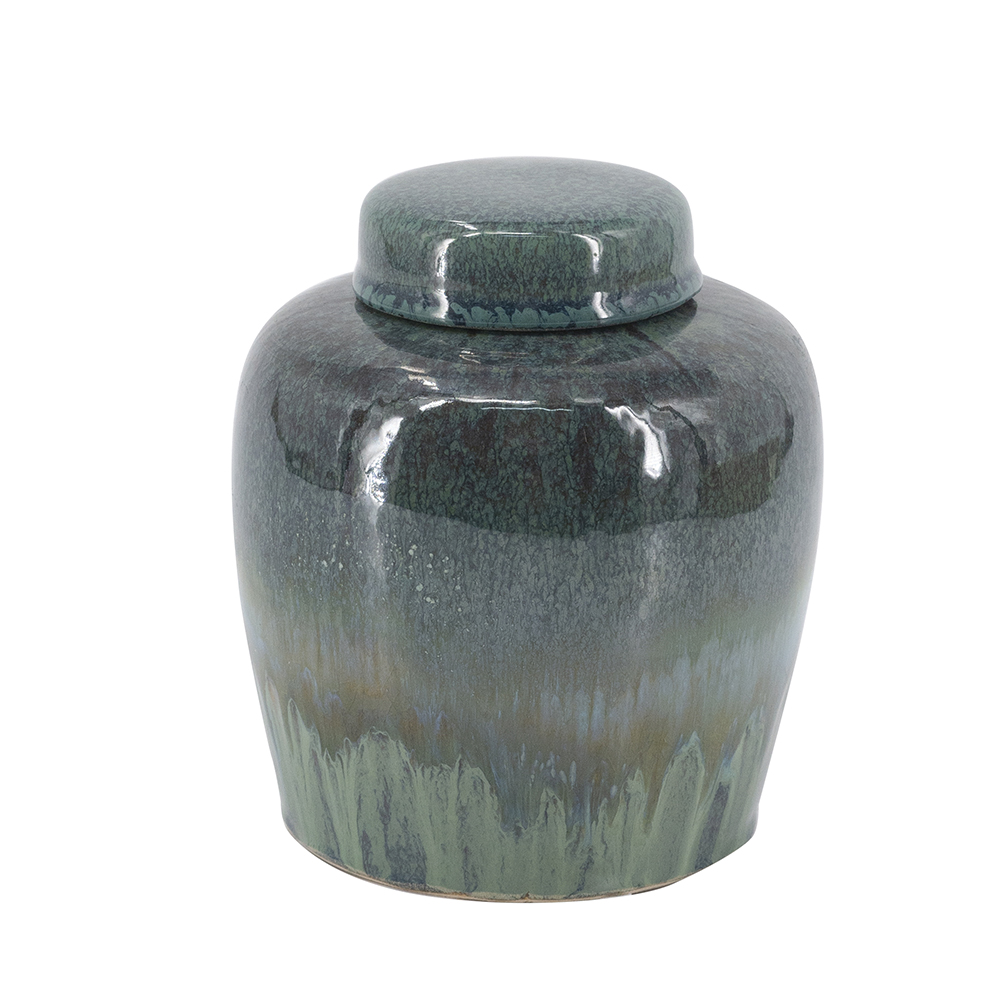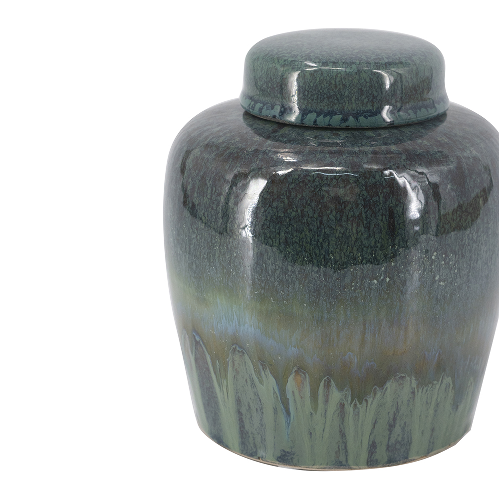 Masterfully crafted from high-quality ceramic, this jar features a round, layered silhouette finished in a rich reactive glaze that flows from teal to deep oceanic blue. Whether displayed on its own, added to a bold vignette, or used as decorative storage, it effortlessly elevates any living room, kitchen, or office.
