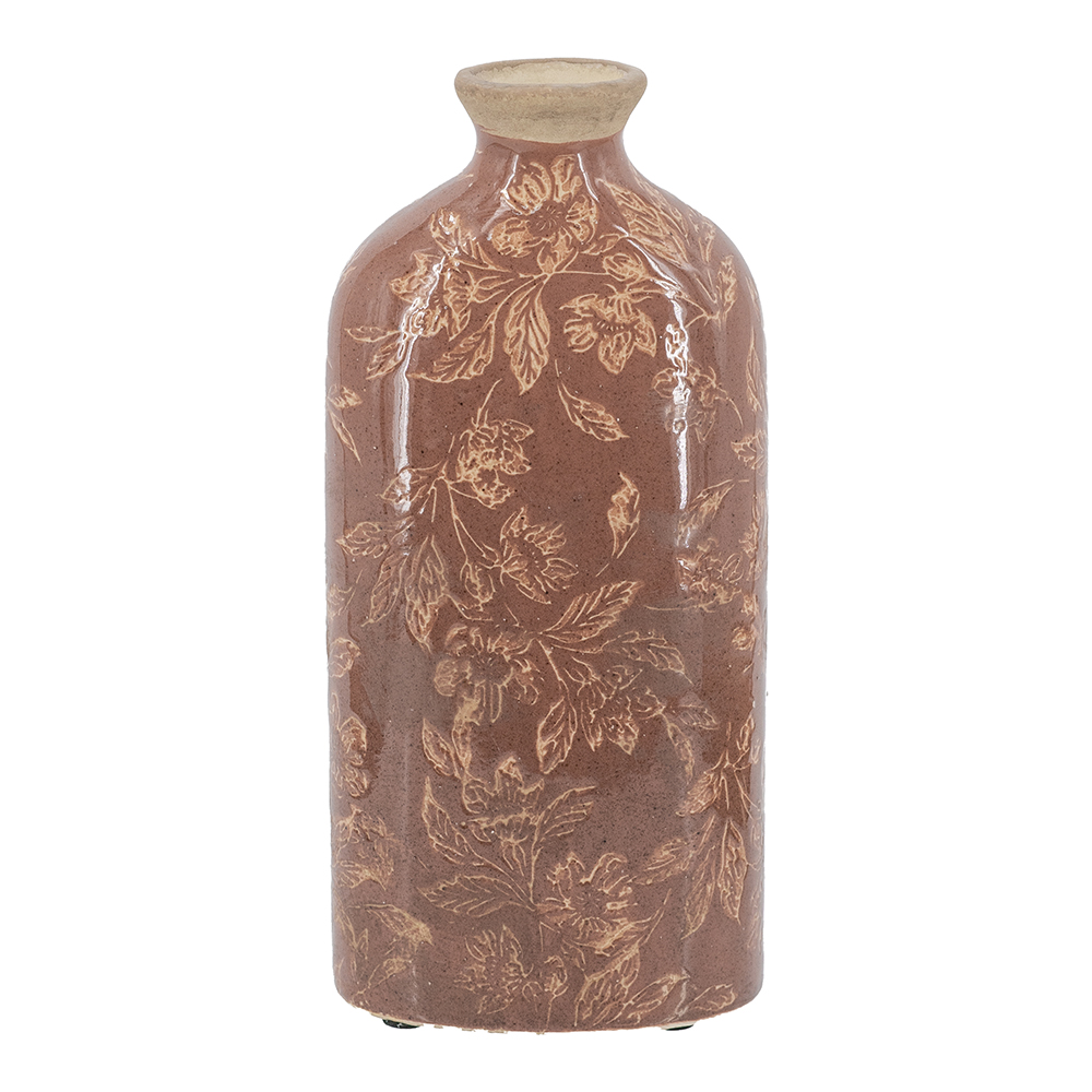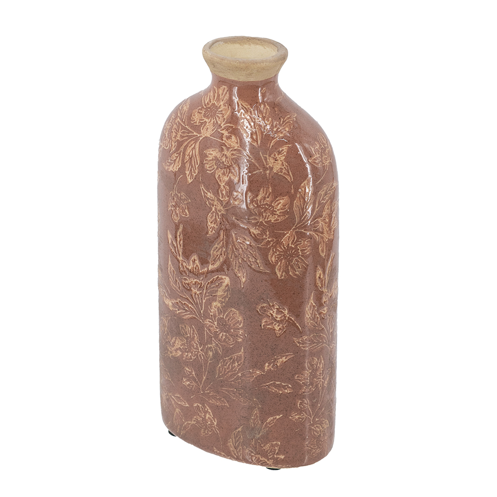 Blending the intrigue of classic European pottery with the cozy charm of an autumn stroll, this vase features a tall cylindrical silhouette, a warm red finish, and delicate floral motifs. Whether displayed on its own or filled with long-stemmed flowers, it draws the eye from any tabletop, mantel, dresser, or sideboard.