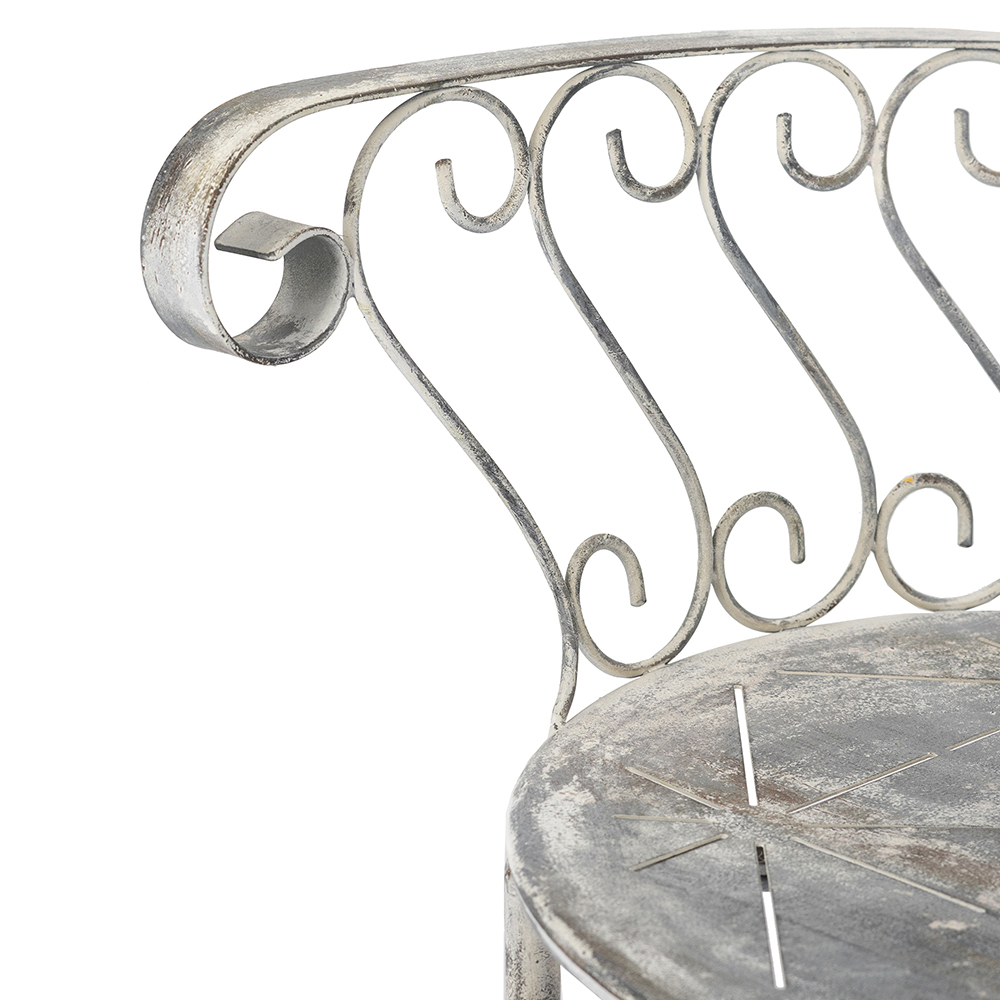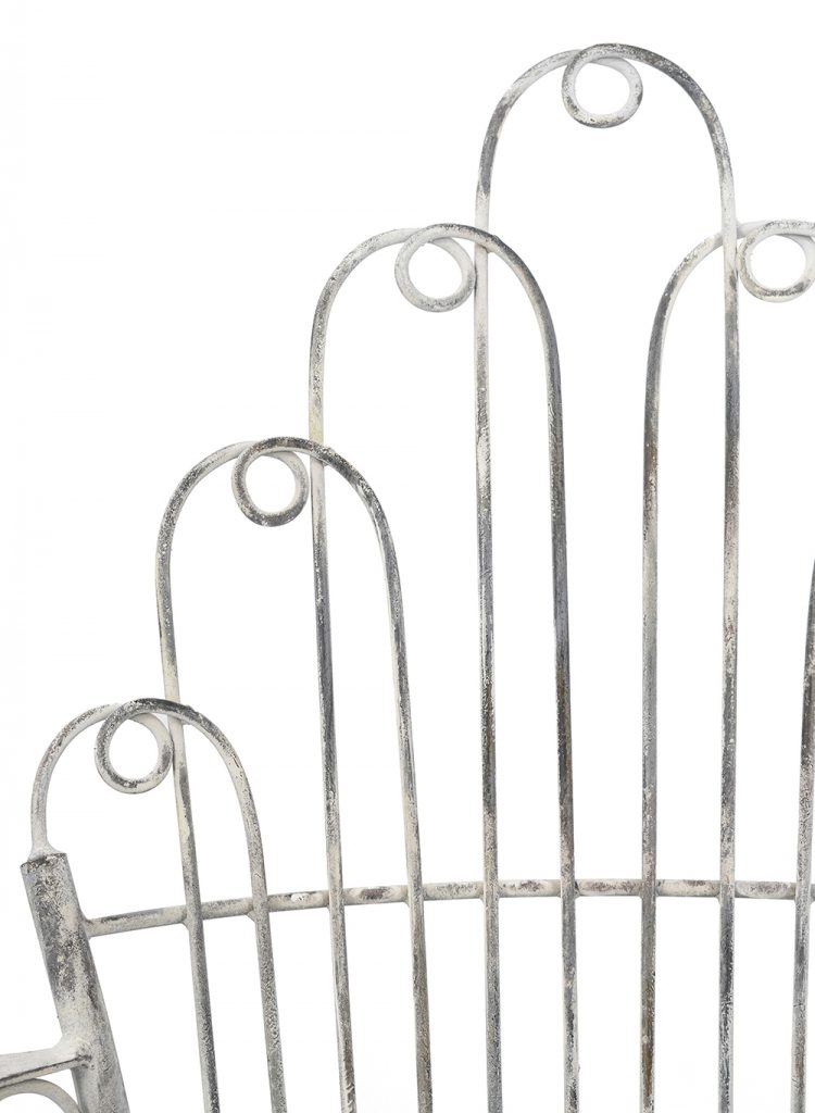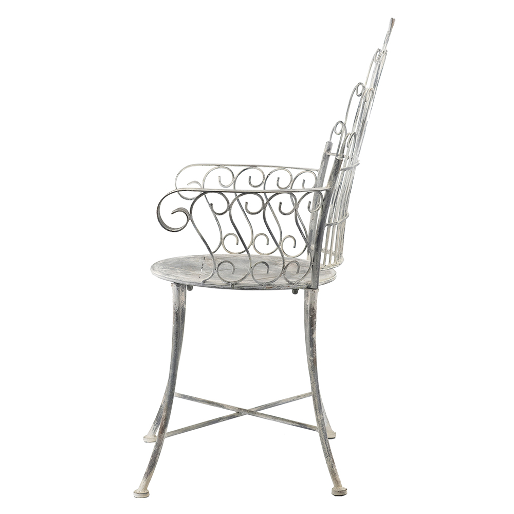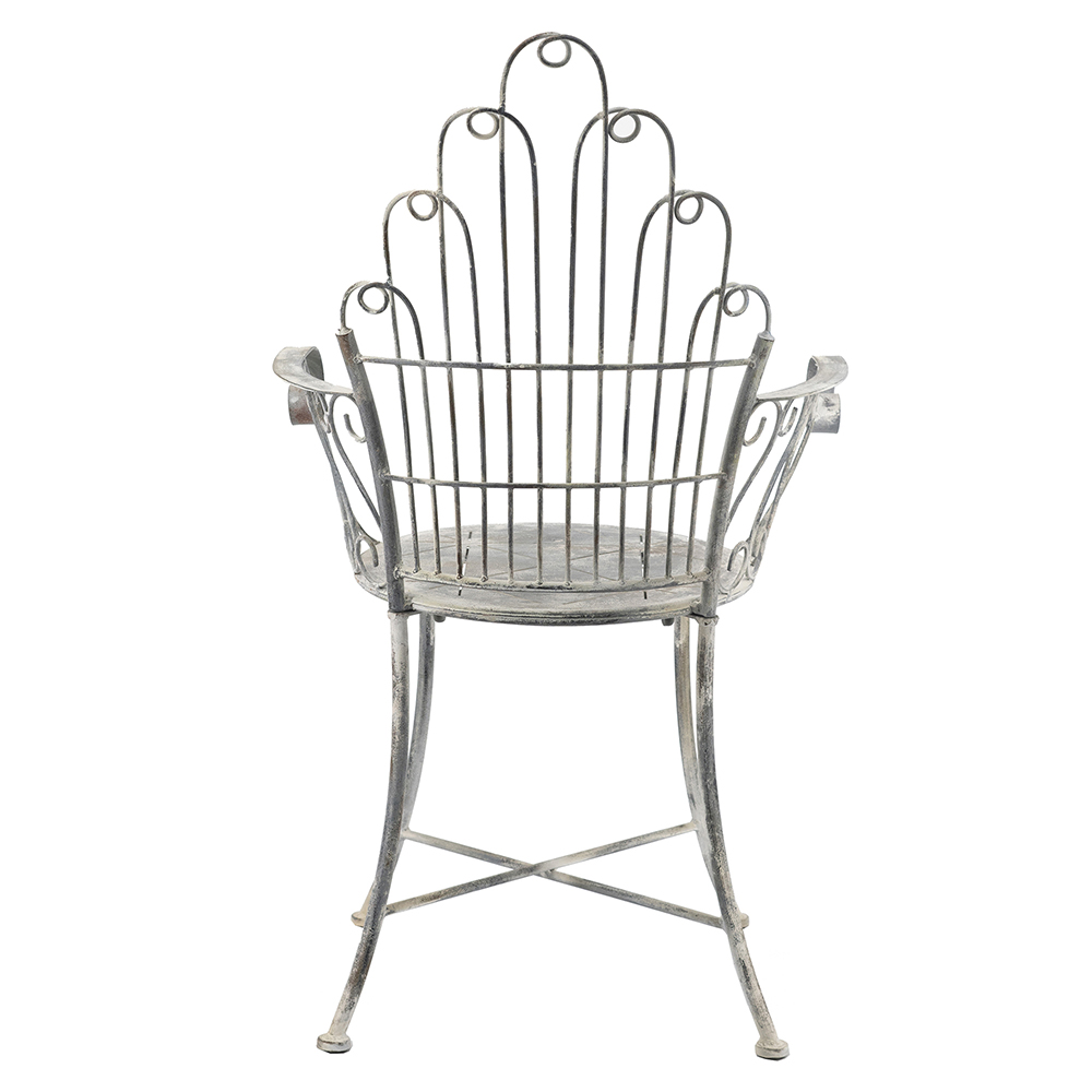 Add timeless elegance to your space with this iron armchair, featuring a dramatic fan-shaped backrest of arched loops for Art Deco flair. Crafted from sturdy iron with a weathered silver patina, it includes graceful scrolled arms and a patterned round seat for comfort. Crossed legs provide stability. Ideal for patios, living rooms, or gardens, blending vintage charm with durable functionality.