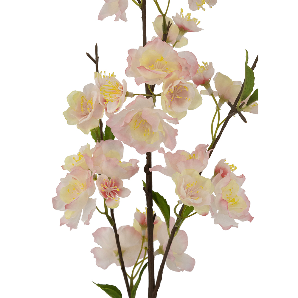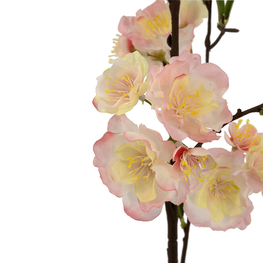 Add delicate spring charm to your decor with this faux pink cherry blossom stem. Soft pink blooms with yellow centers on a realistic brown stem with green leaves mimic natural blossoms. 38.6 inches tall, perfect for vases, centerpieces, or accents, offering serene elegance. Maintenance-free and lifelike for lasting beauty.