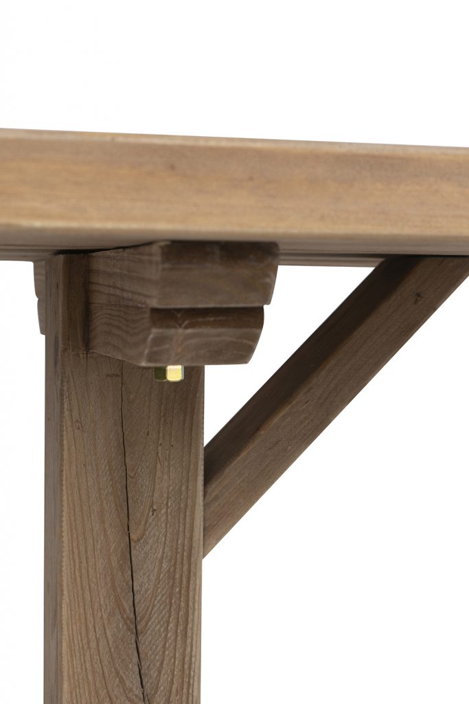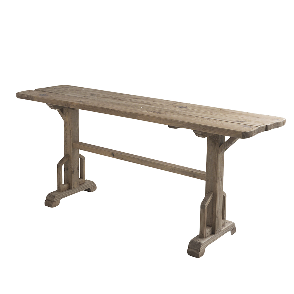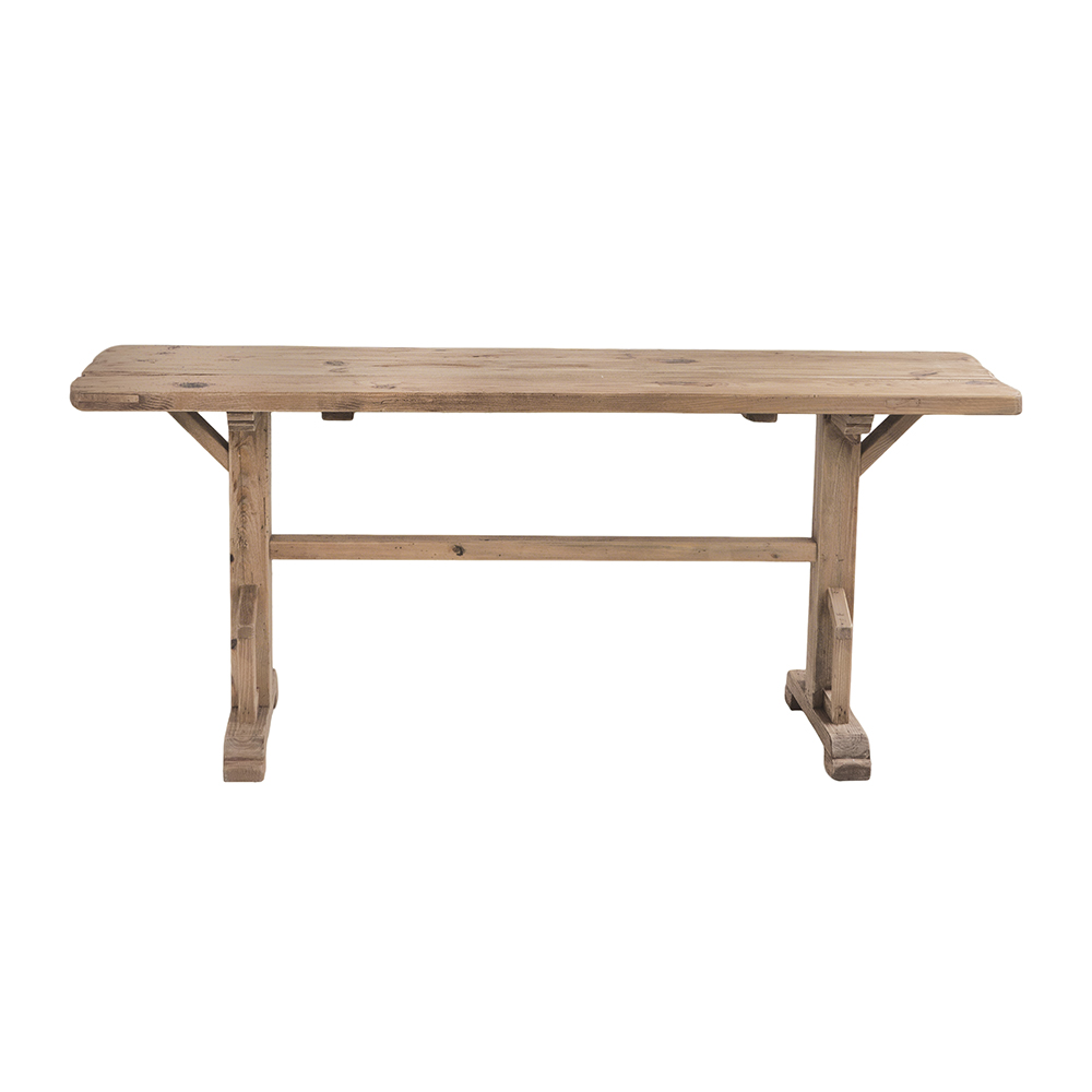 Blending the charm of earthy design with a touch of vintage countryside beauty, this console table features a long rectangular top, a natural brown finish, and a sturdy trestle base. Crafted from 100% recycled pine wood, it offers exceptional durability and stability, making it a practical, eco-friendly addition to any home.