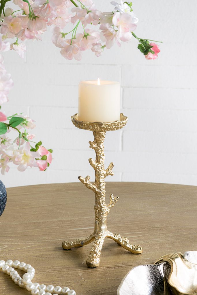 Marrying the effortless beauty of nature with a touch of modern luxury, this candle holder features a slender, coral-inspired design, finished in rich gold. Pair it with a pillar candle to cast a warm, relaxing glow in your living room, dining room, entryway, or office.