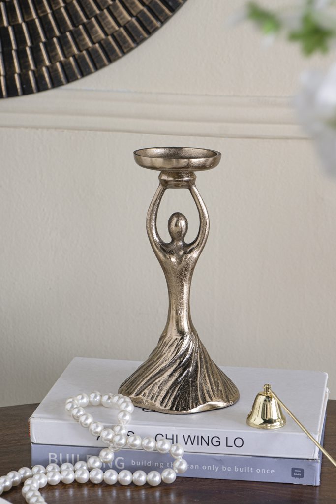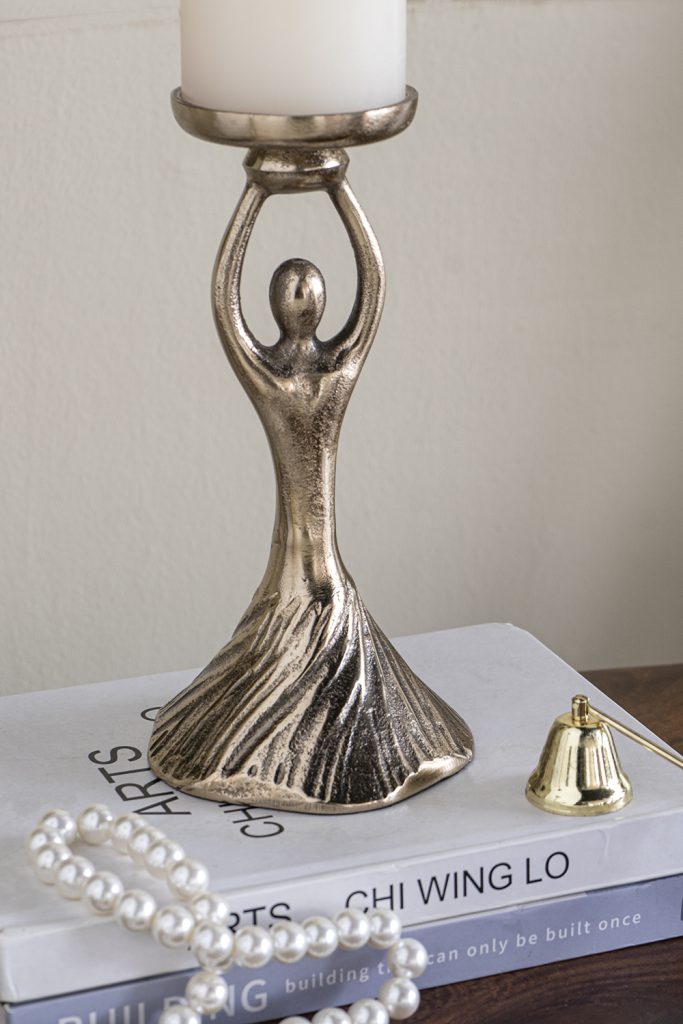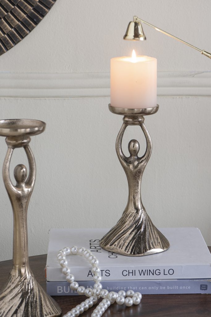 A captivating display of abstract beauty, this pillar holder showcases an elongated human figurine, a textured pedestal base, and a rounded platform at the top. Perfectly sized for standard pillar candles, it will spread a relaxing ambiance throughout any room while infusing your decor with a graceful touch.