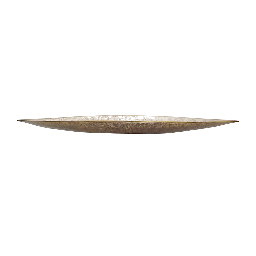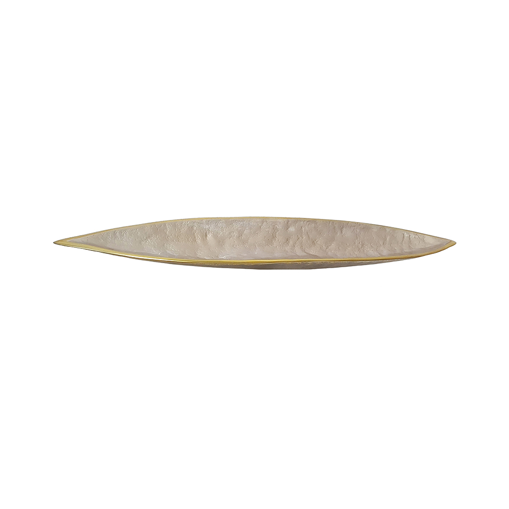 Marrying the effortless beauty of nature with abstract artistry, this tray features a curved, elongated leaf silhouette, a warm champagne gold finish, and subtle textured detailing. Whether used to hold jewelry, fruit, or everyday essentials, it is sure to elevate any living room, entryway, or bedroom.