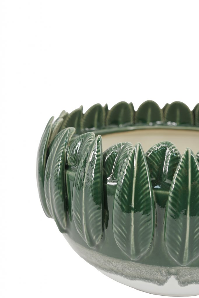 Bring lush tropical vibes to your decor with this ceramic bowl featuring a crown of detailed green leaves around the rim for a natural, artisanal touch. The smooth ombre body fades from emerald green to soft white, creating a fresh gradient effect. It’s perfect for fruits, potpourri, plants, or as a standalone accent in boho, coastal, or modern spaces on tables, counters, or shelves.