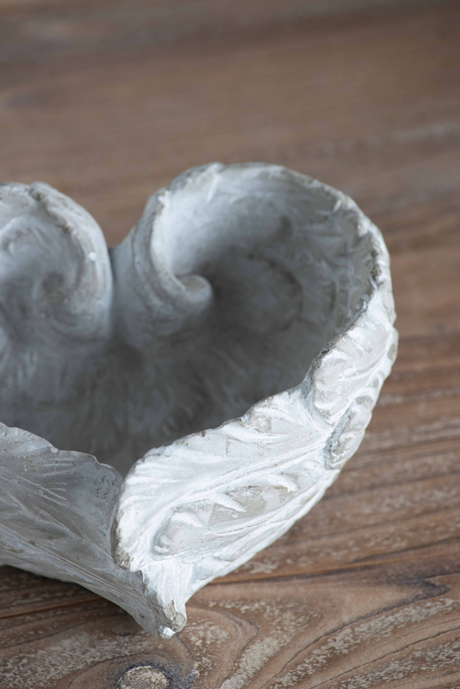 With a gentle whitewash finish, the evocative medium-sized Skye Heart-Winged Decorative Bowl offers a distinctively beautiful look and surprising versatility. Use this bowl anywhere in the home to organize and store small items. Perfect for a master bedroom, vintage sunroom, or kitchen counter, the Skye Bowl also features the durability to add lavish style to any outdoor space.
