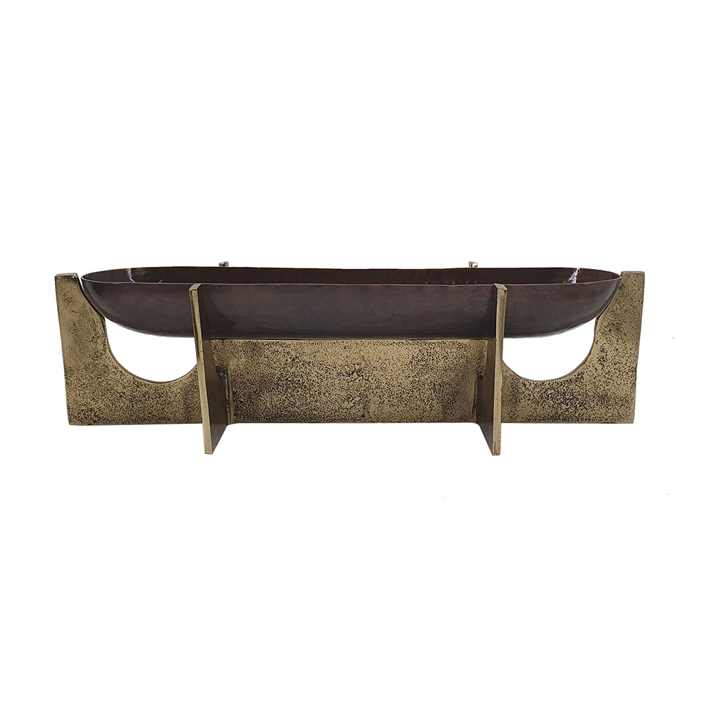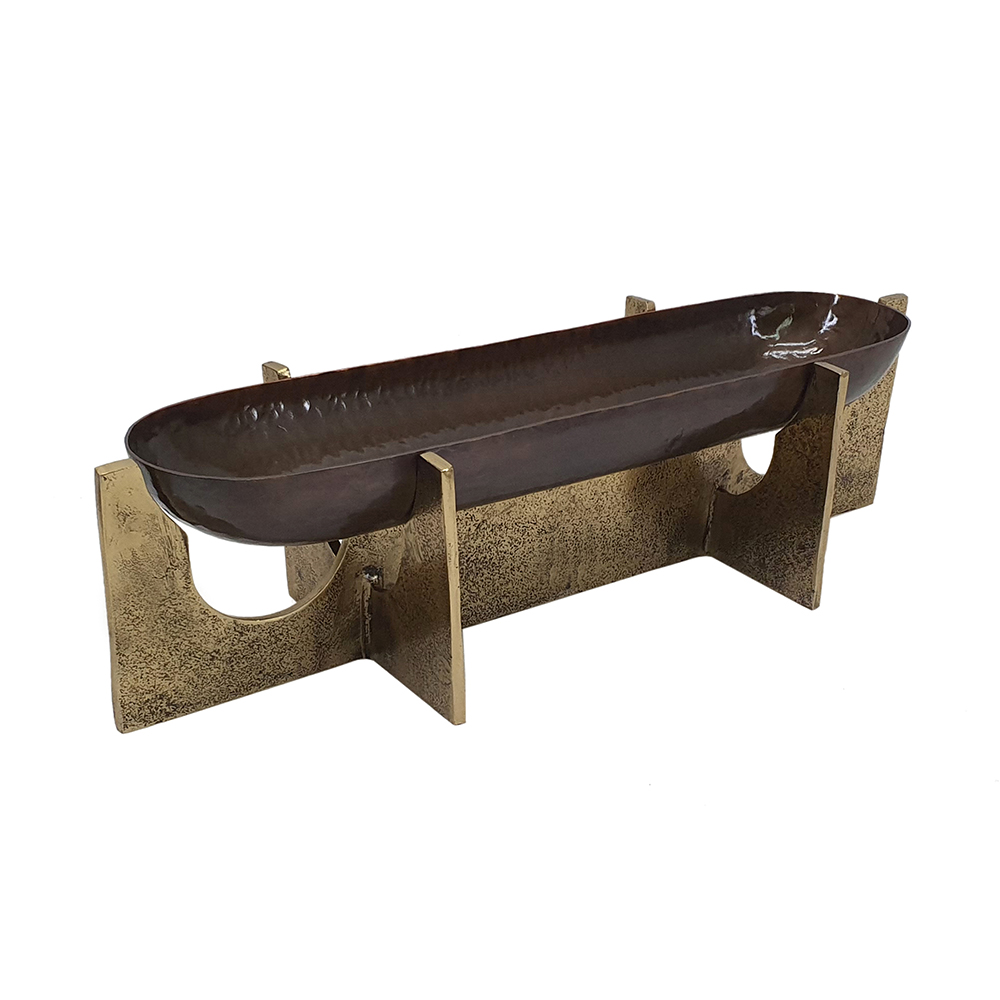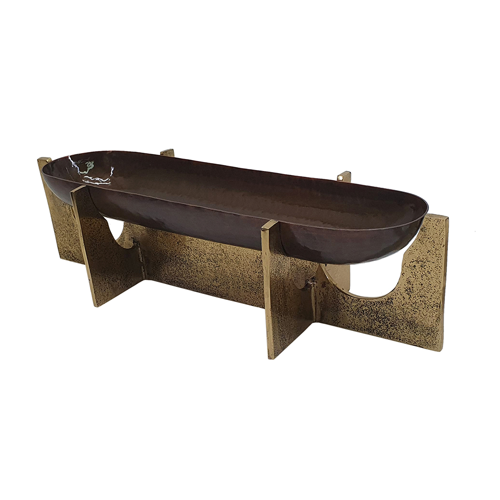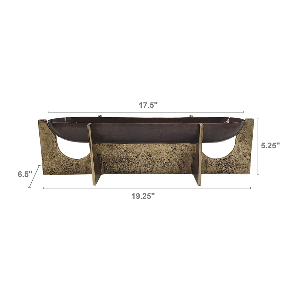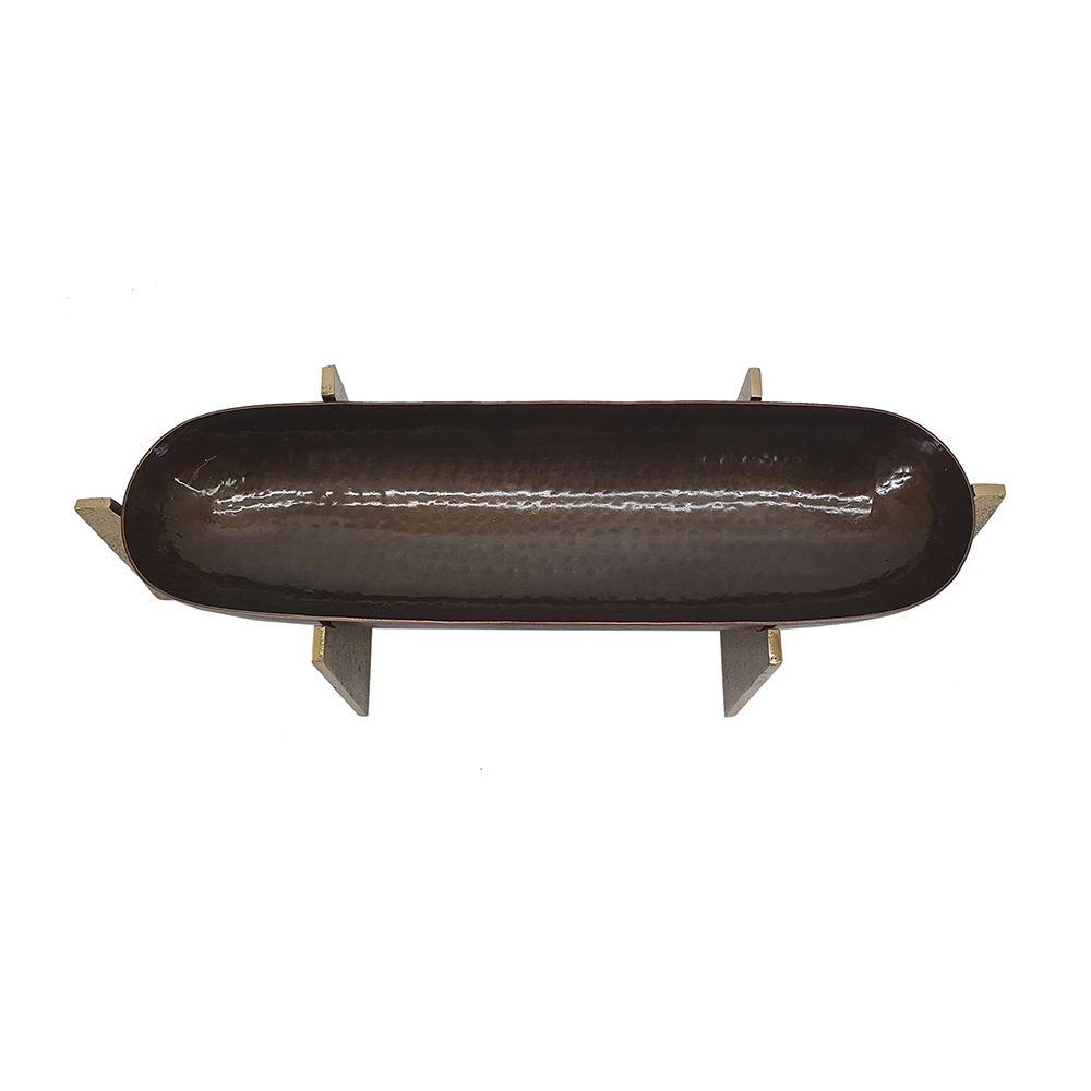 Elevate your entertaining with this aluminum serving tray, featuring an oval hammered bronze surface and geometric gold stands for rustic luxury. It’s ideal for serving snacks, displaying decor, or organizing items on coffee tables or ottomans. Versatile for indoor use, this lightweight piece blends modern style with timeless appeal, perfect as functional decor or thoughtful gift for any occasion.