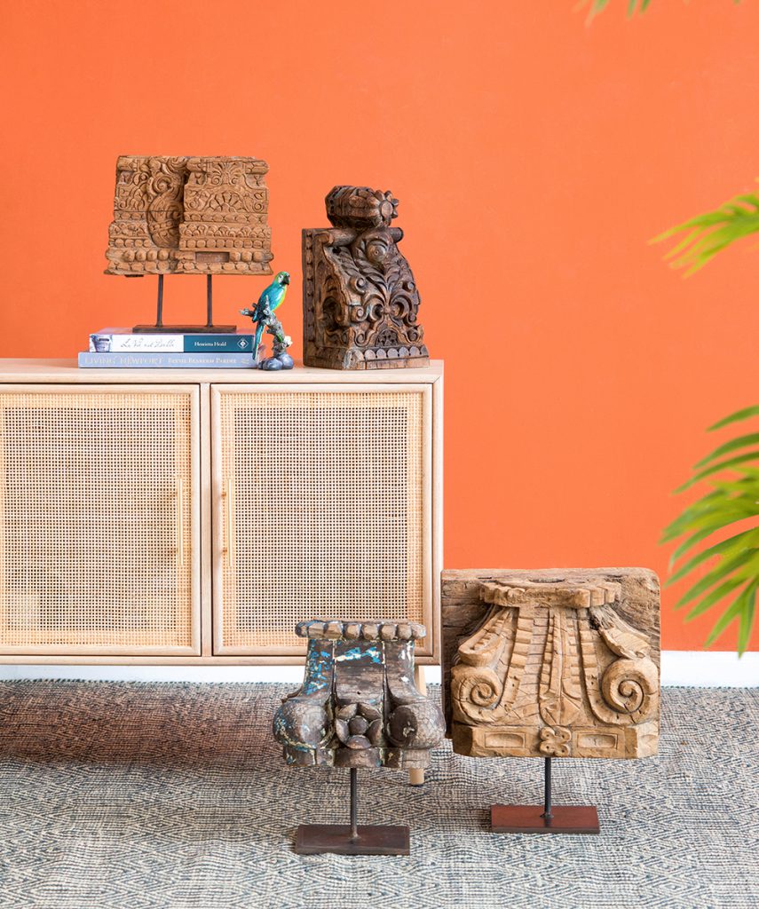 This decorative pillar base on a metal stand blends a classical motif with transitional style. Made from distressed wood with a metal base, it features intricate gray-carved detailing inspired by ancient Roman design. A modern touch perfect for finishing shelves and key tables, each piece is crafted from reclaimed antique wood, making it unique with variations in size, shape, and color.