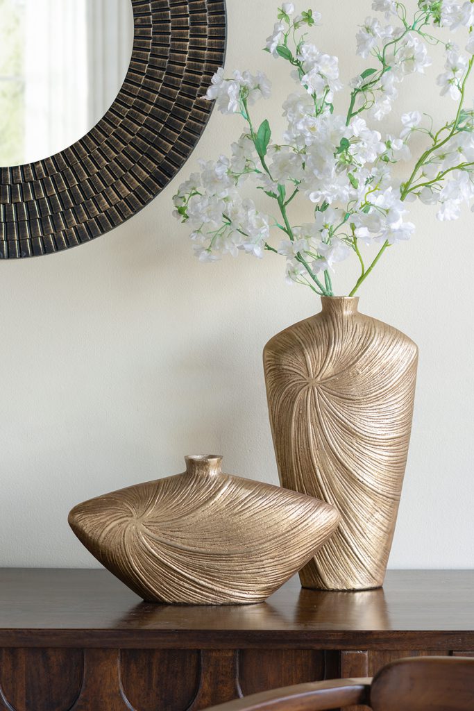 Capturing the free-flowing beauty of organic design, this vase boasts a wide, abstract silhouette, a metallic gold finish, and embossed swirling patterns. Whether displayed on its own, as part of a rich ensemble, or paired with vibrant flowers, it will bring an instant touch of charm to any tabletop, counter, or shelf.