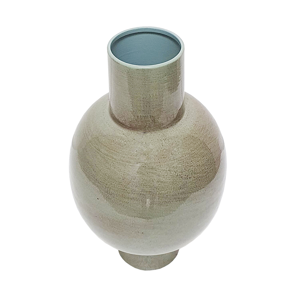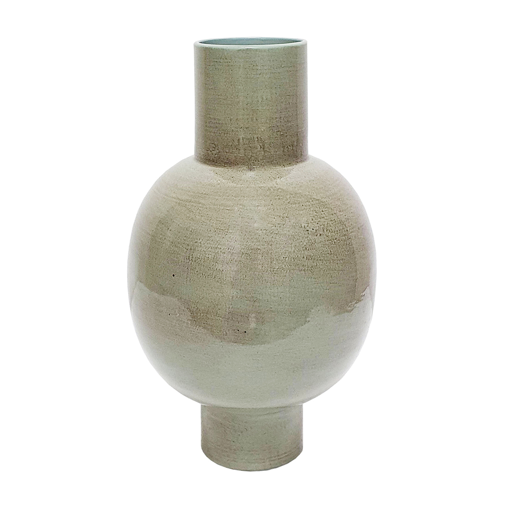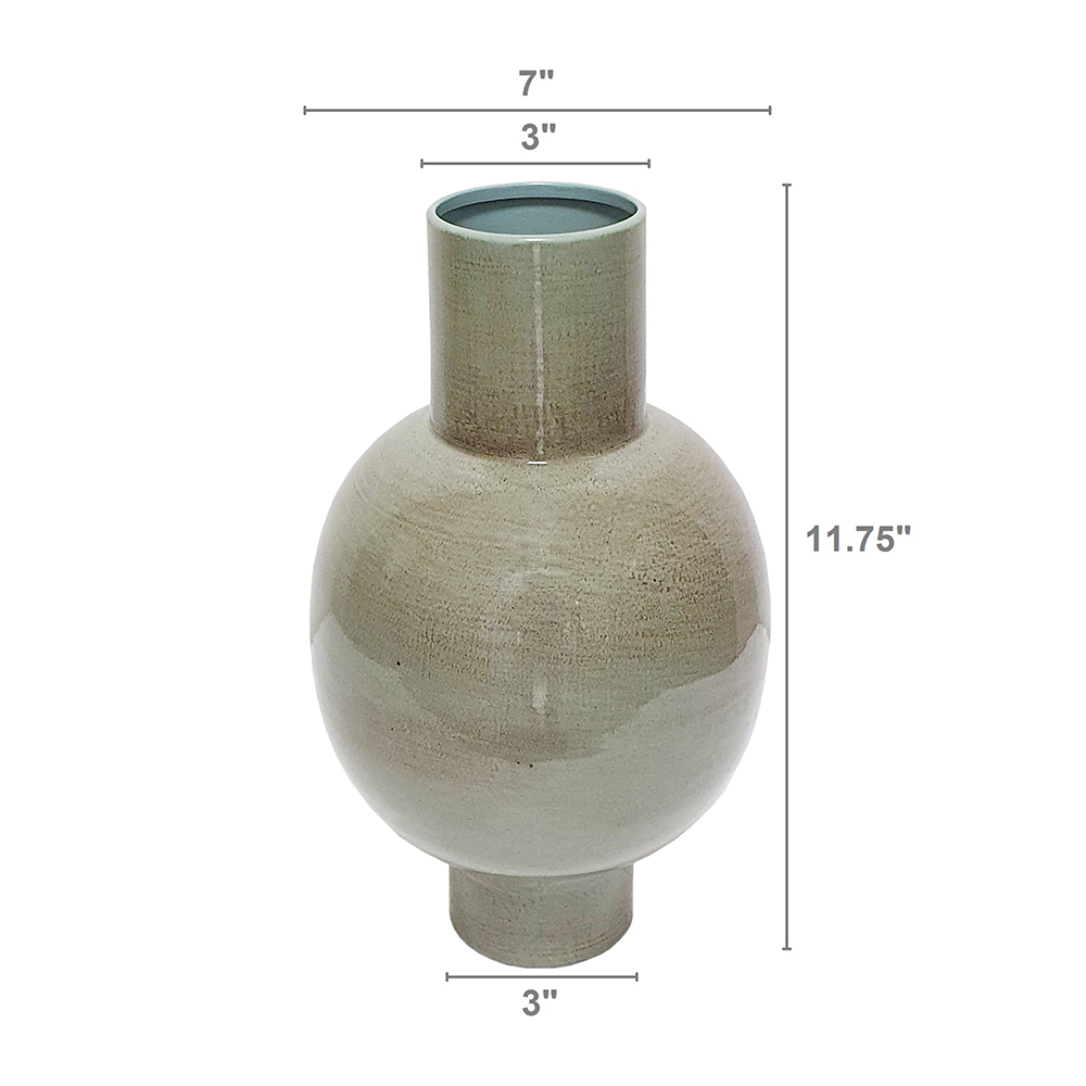 With its rounded silhouette, subtly textured olive green finish, and cylindrical neck, this vase brings an understated touch of sophistication to any space. Crafted from durable iron, it offers lasting beauty and timeless appeal, drawing the eye whether displayed alone or paired with long-stemmed florals.