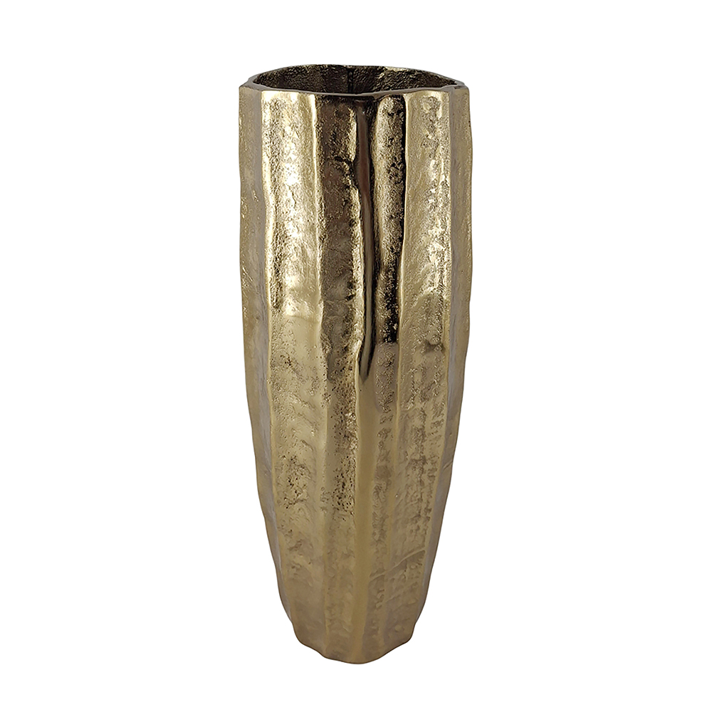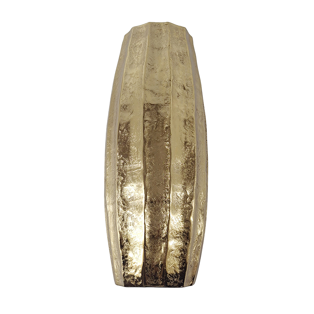 Elevate your decor with this stunning aluminum vase in a shimmering gold finish, featuring vertical ribbed texture for a hammered, artisanal look that adds depth and sophistication. Its tapered, gourd-like shape creates an elegant silhouette, perfect for tall stems, pampas grass, or as a standalone. It suits contemporary, boho, or rustic spaces on floors, tables, or mantels for instant luxury.