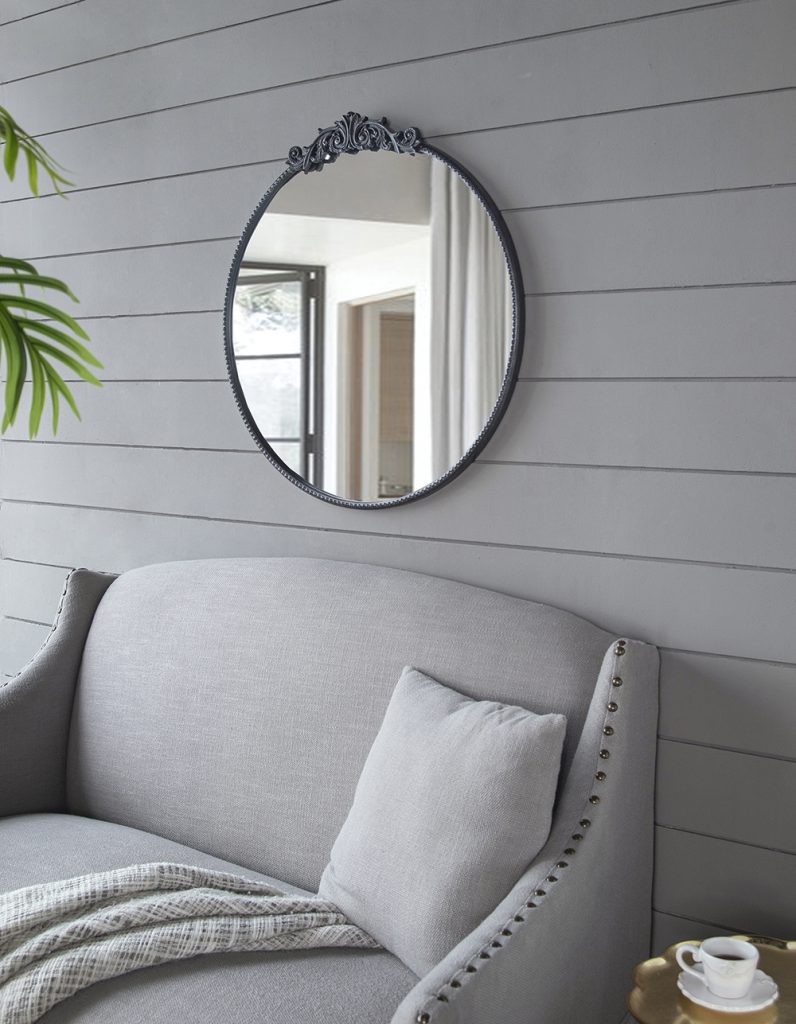 The Dia mirror is a classic statement piece for any home. Perfect in a powder room or hallway, this mirror features a round shape and baroque inspired framing for appeal.