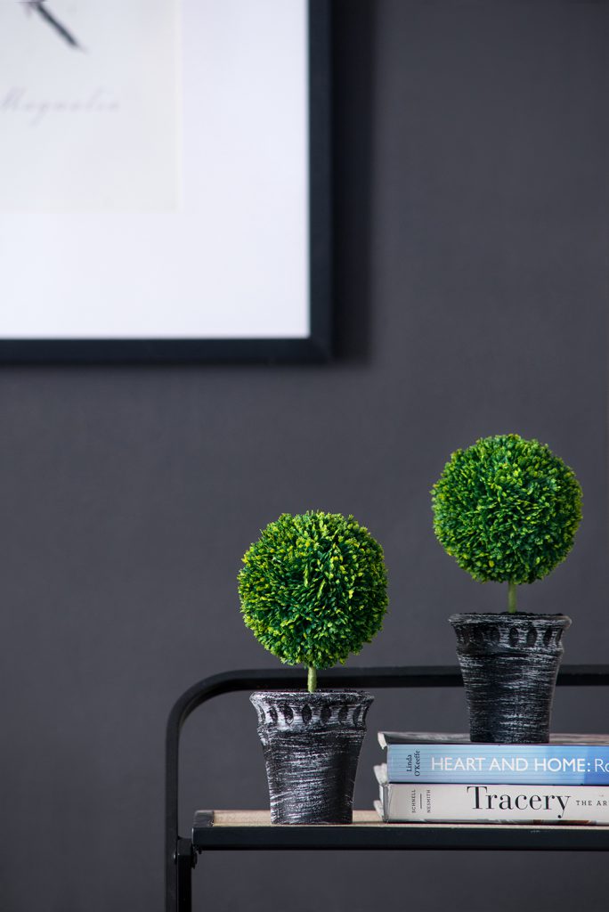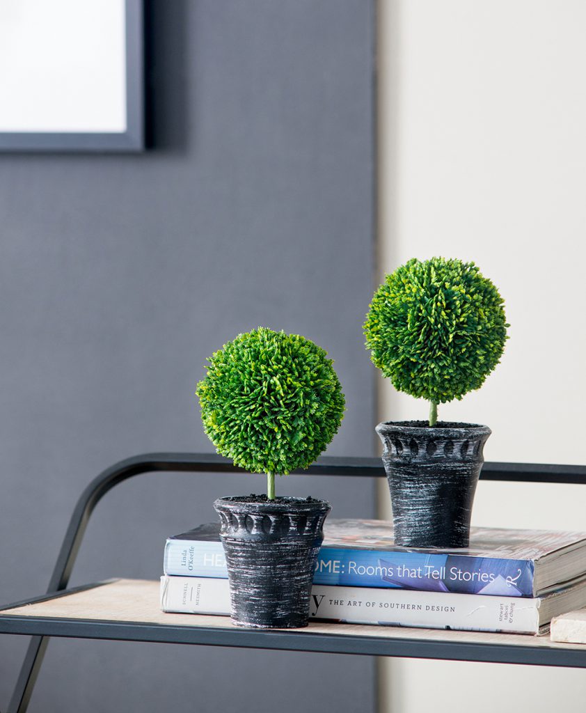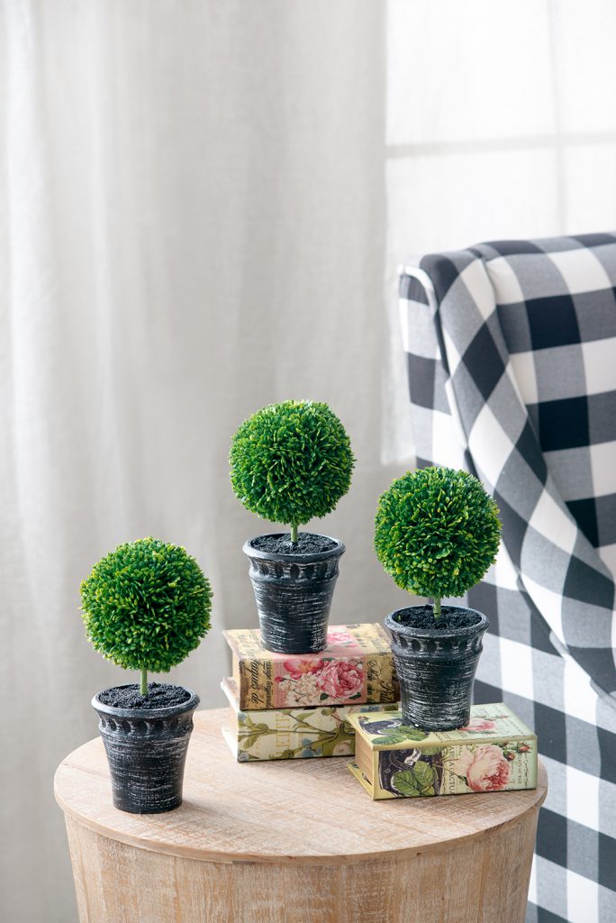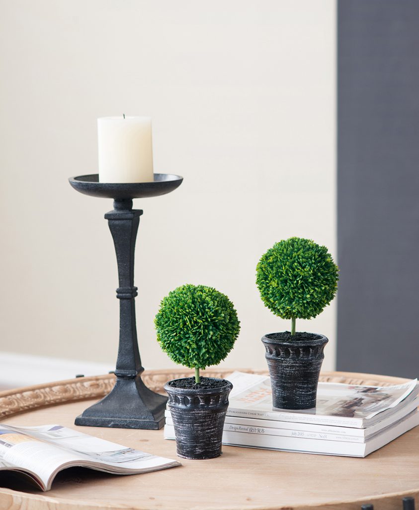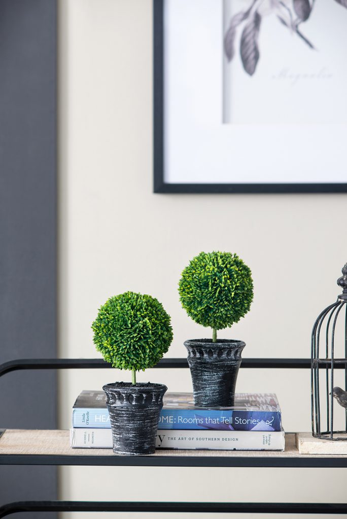 This set of two Mini Faux Topiaries “planted” in black pots offer a lush, opulent look in miniature scale. With deep green color and natural detailing, these faux topiaries make a cheerful addition to a bathroom, kitchen, or anywhere that lacks the natural light needed for real plants. These attractive topiaries offer all the beauty of nature without the hassle of real greenery.