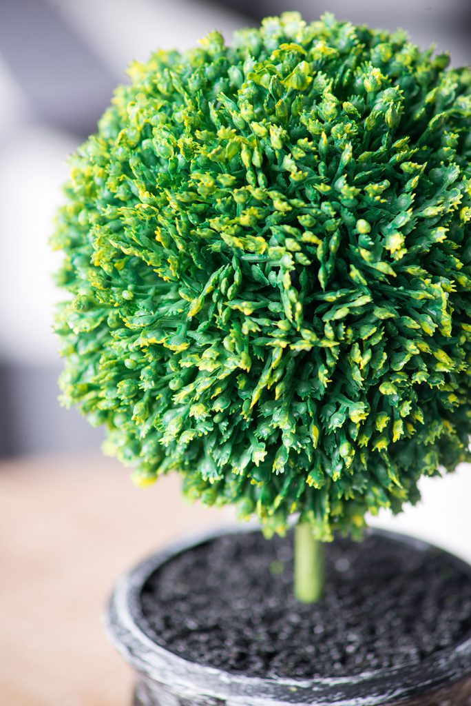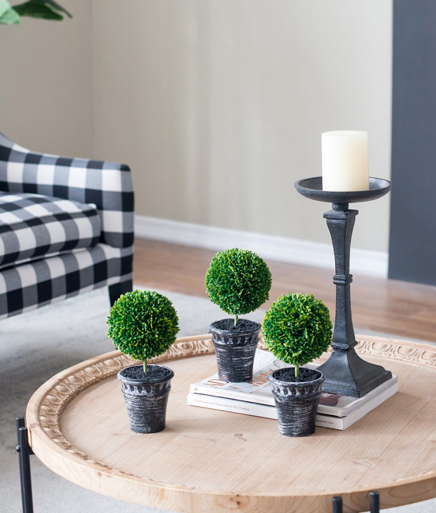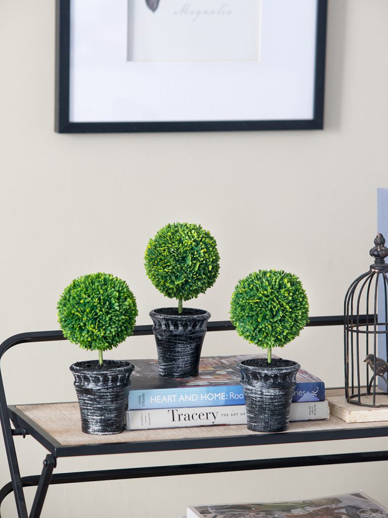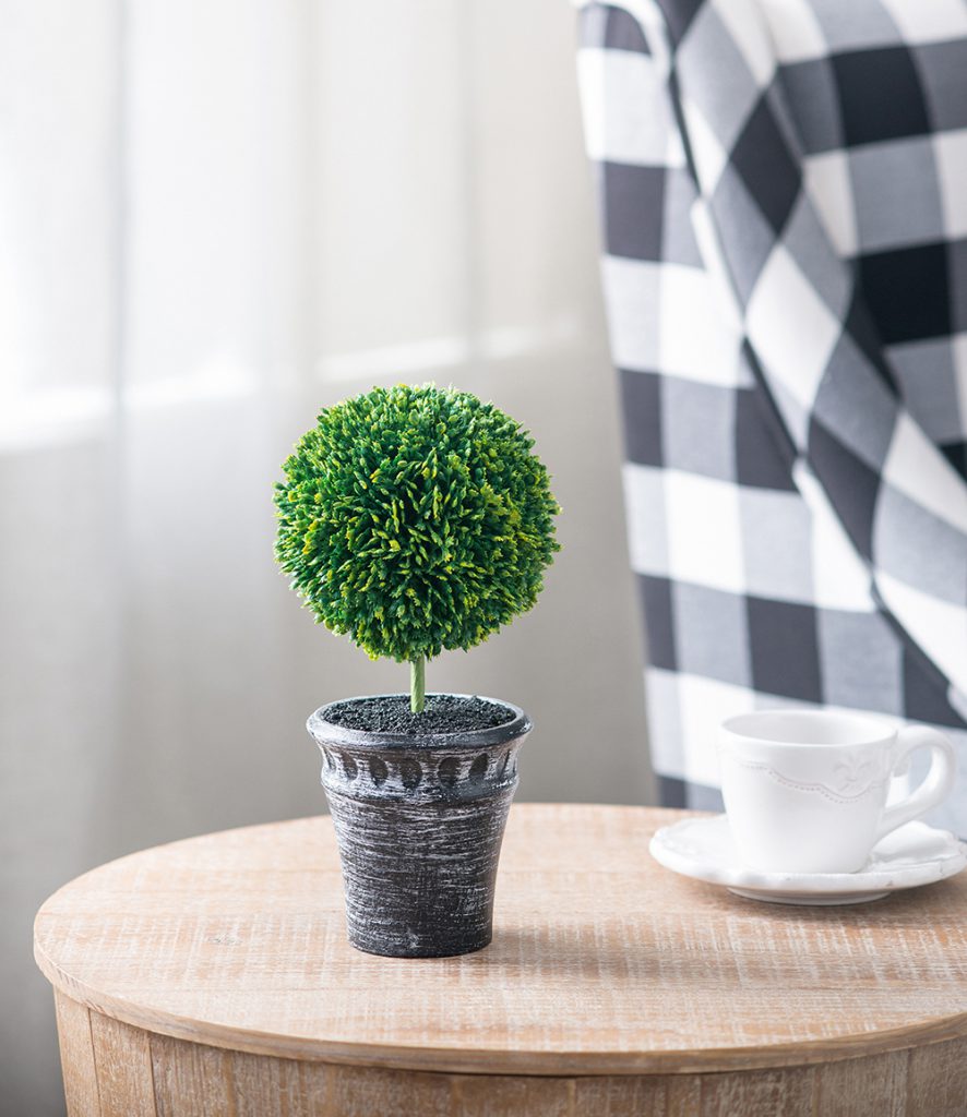 This set of two Mini Faux Topiaries “planted” in black pots offer a lush, opulent look in miniature scale. With deep green color and natural detailing, these faux topiaries make a cheerful addition to a bathroom, kitchen, or anywhere that lacks the natural light needed for real plants. These attractive topiaries offer all the beauty of nature without the hassle of real greenery.