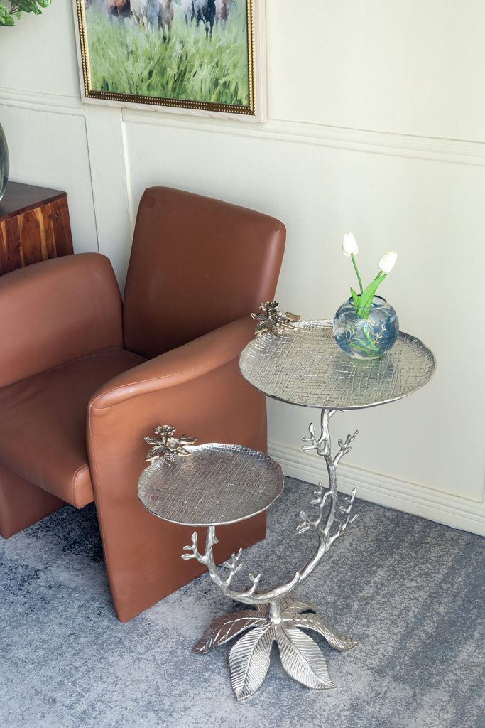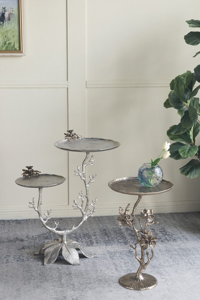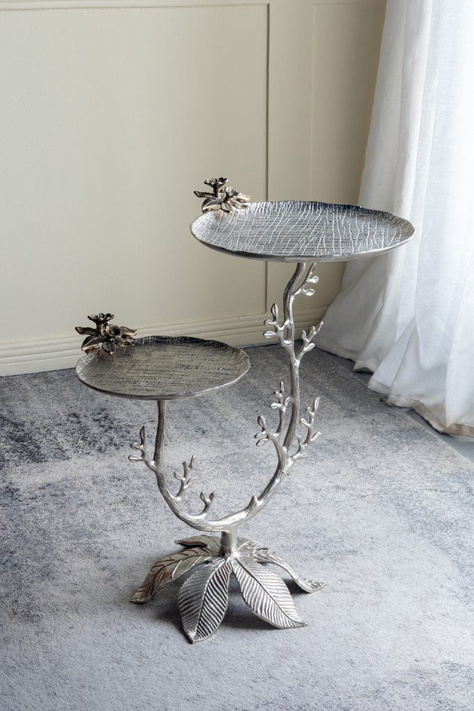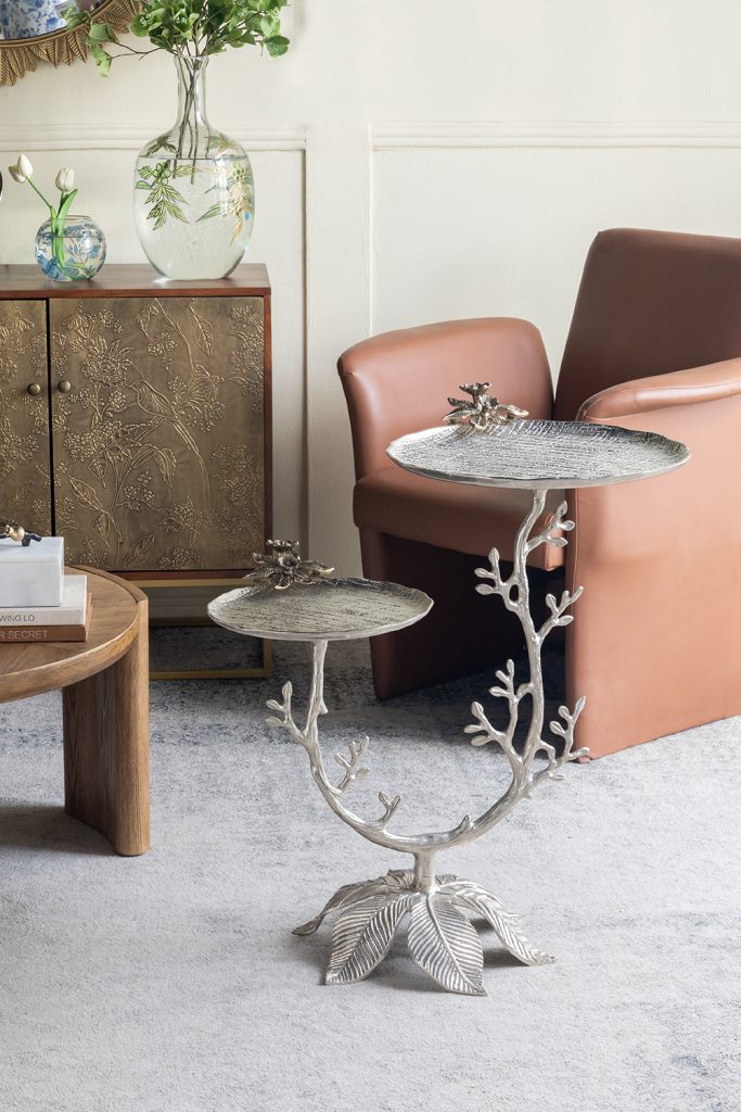 Blending the refined charm of classic design with organic allure, this accent table features a twisting branch silhouette, two textured trays at different heights, and an intricate leaf base. Whether placed chairside in your living room, in your entryway, or beside your bed, it will infuse your decor with a luxurious touch.