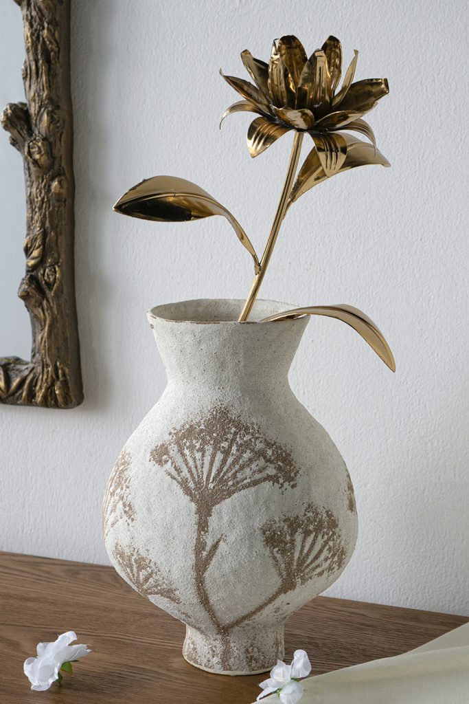 Bring the graceful beauty of nature into your home with this elegant metal flower sculpture. Featuring an intricate bloom, curling leaves, and a refined gold finish, it is sure to capture the eye whether placed in a centerpiece vase, added to a faux floral arrangement, or displayed on a mantel or shelf.