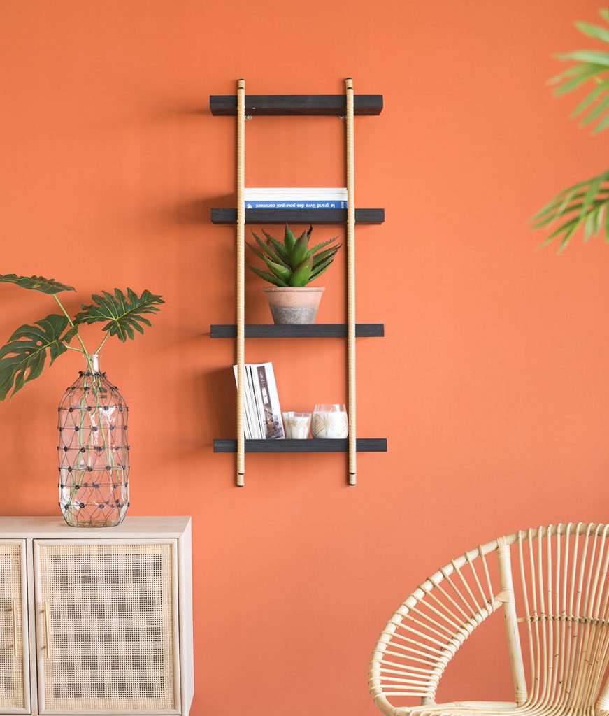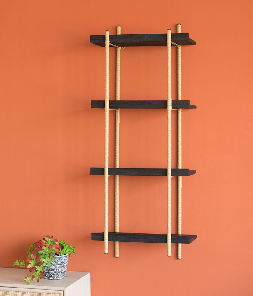 A functional furnishing with transitional appeal,this piece has four black shelves that provide a bold contrast to the natural brown finish on the vertical supports.This contemporary shelving unit adds versatile storage to a living room,office,or dining room.Use these tall shelves to display books,knick-knacks,pictures,or collectibles.