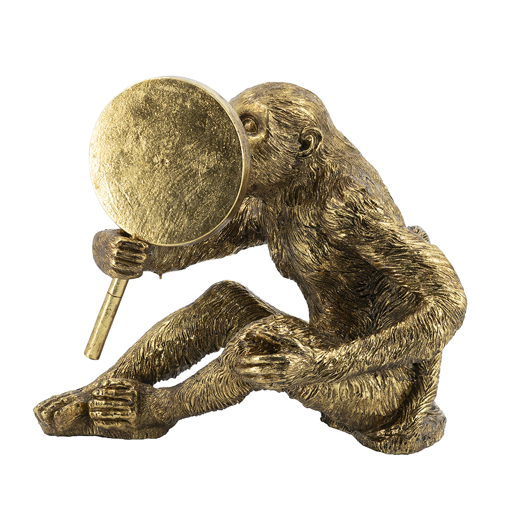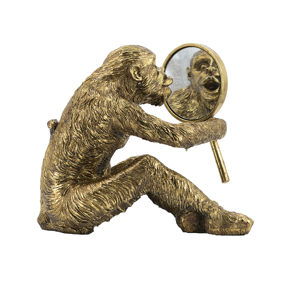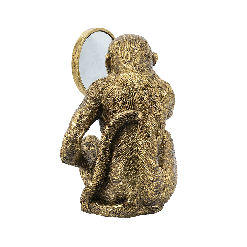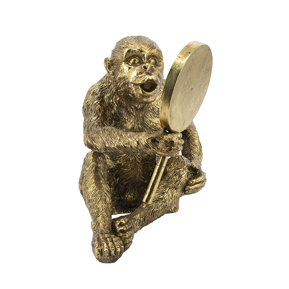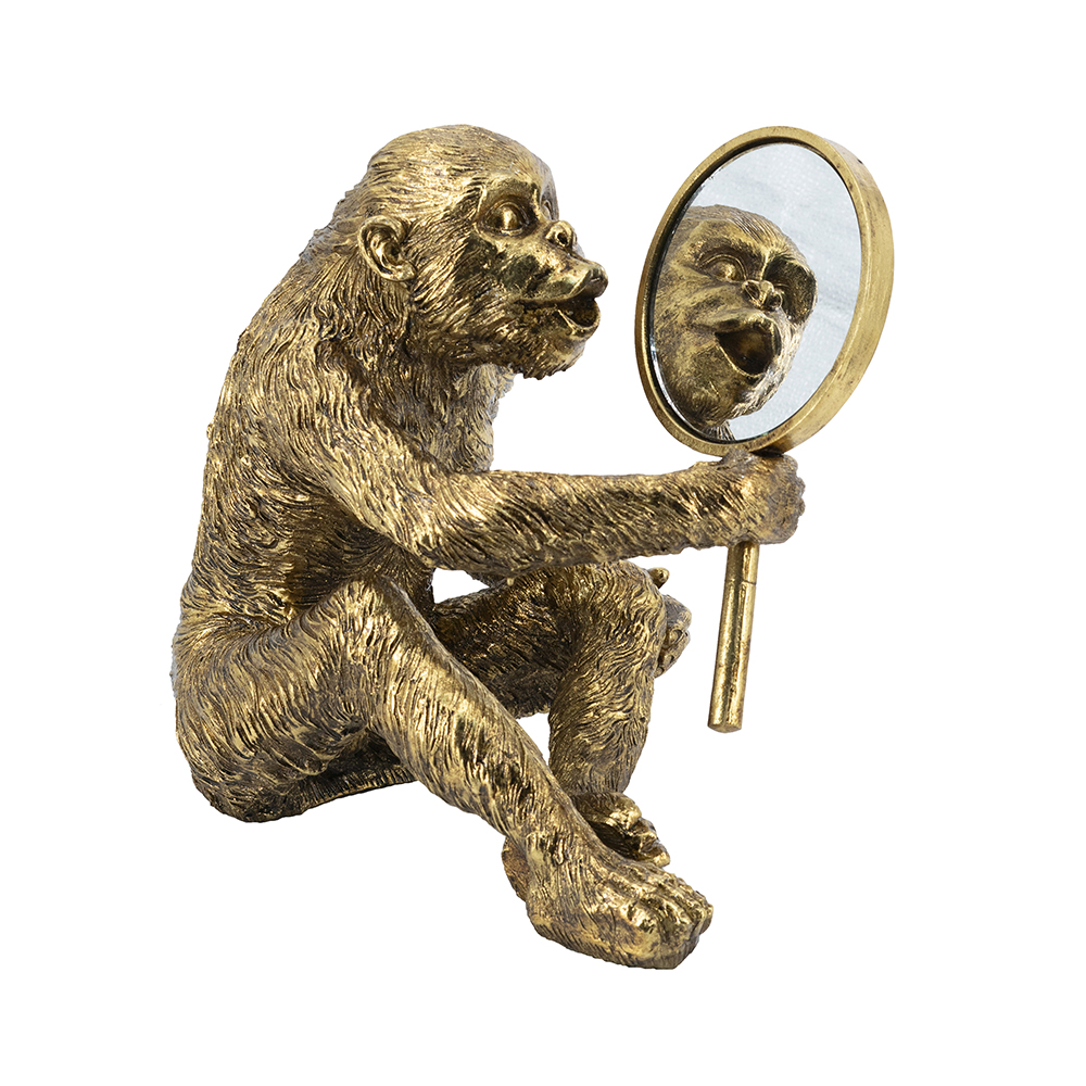 Bring playful sophistication to your space with this handcrafted resin monkey sculpture, featuring a curious primate holding a mirror, revealing a surprised reflection in gold finish. At 15.5×9.5×14 inches, its detailed fur and pose add humor to shelves or vanities. Ideal for homes or offices, this piece blends whimsy with elegance, perfect as decor or gift.