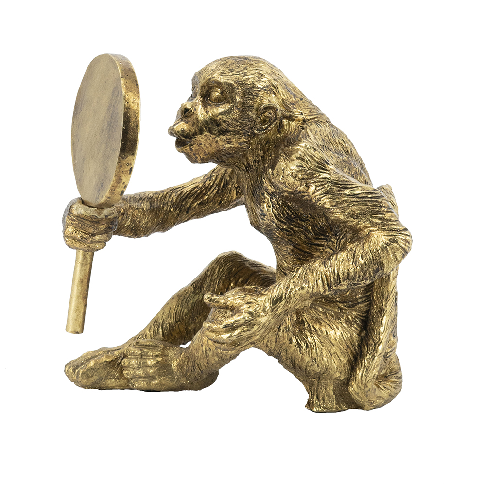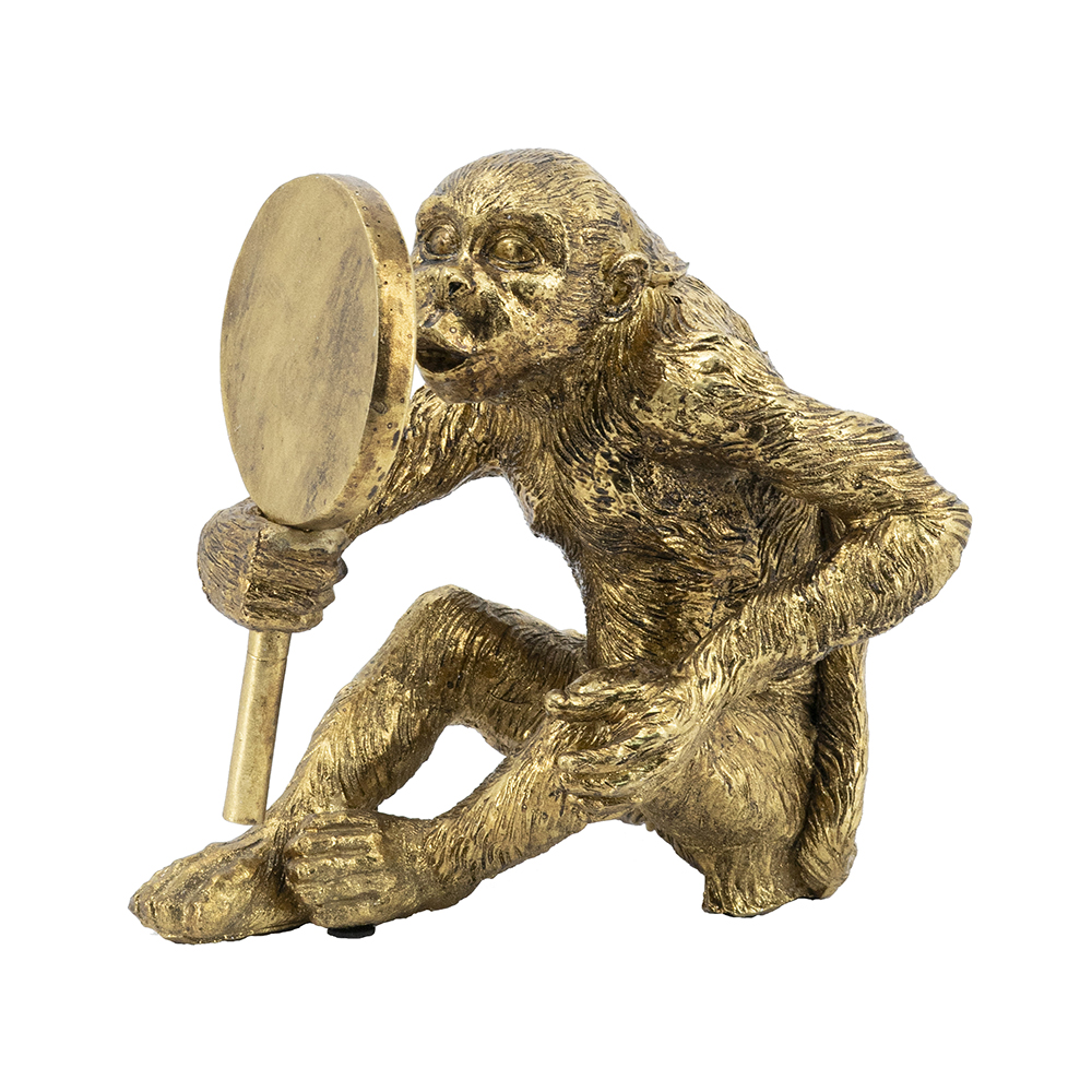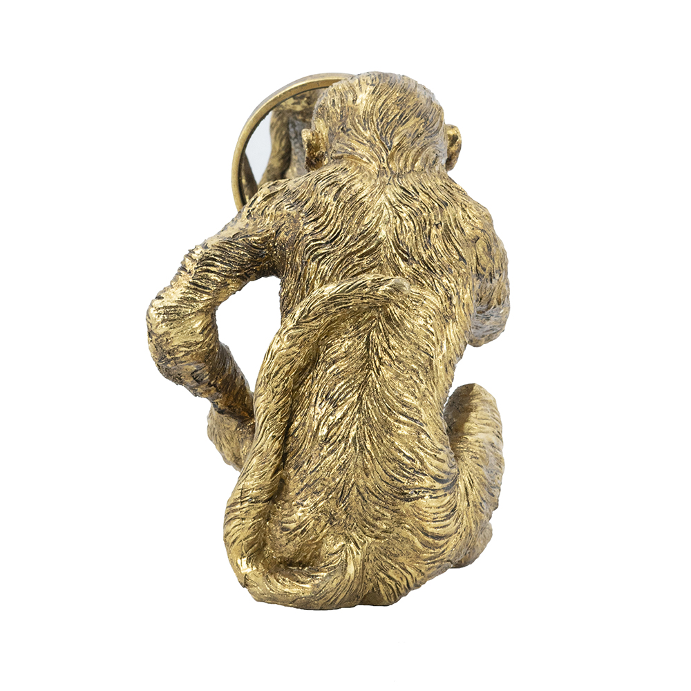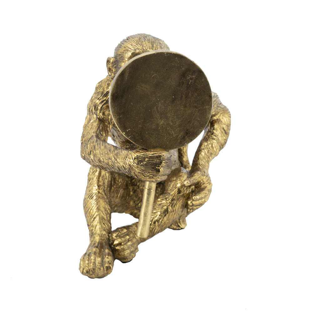 Infuse humor and style into your space with this handcrafted resin monkey sculpture, depicting a playful primate holding a round mirror to its ear like eavesdropping, in a gleaming gold finish. Measuring 9.5×6.5×10 inches, its detailed fur and cheeky expression add whimsical charm to shelves or desks. Perfect for homes or offices, this piece combines fun with elegance, ideal as decor or gift.