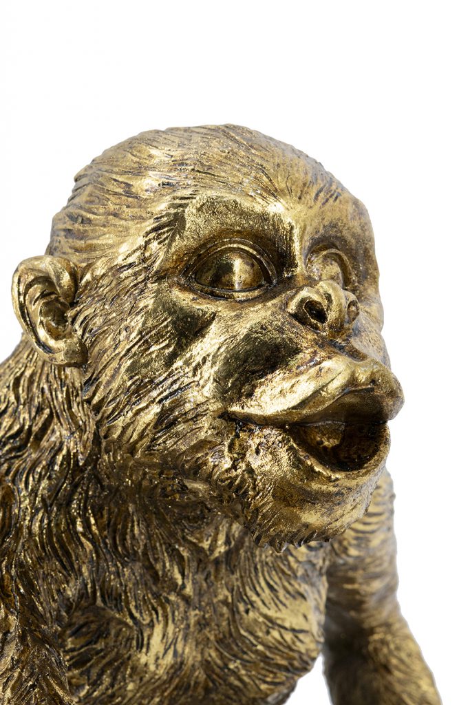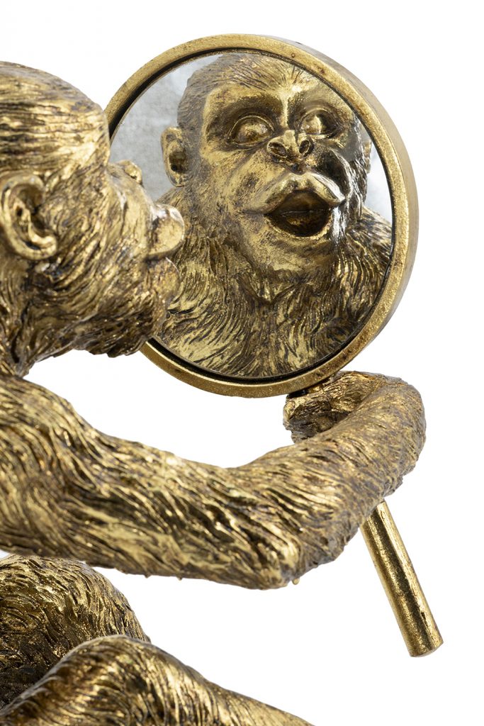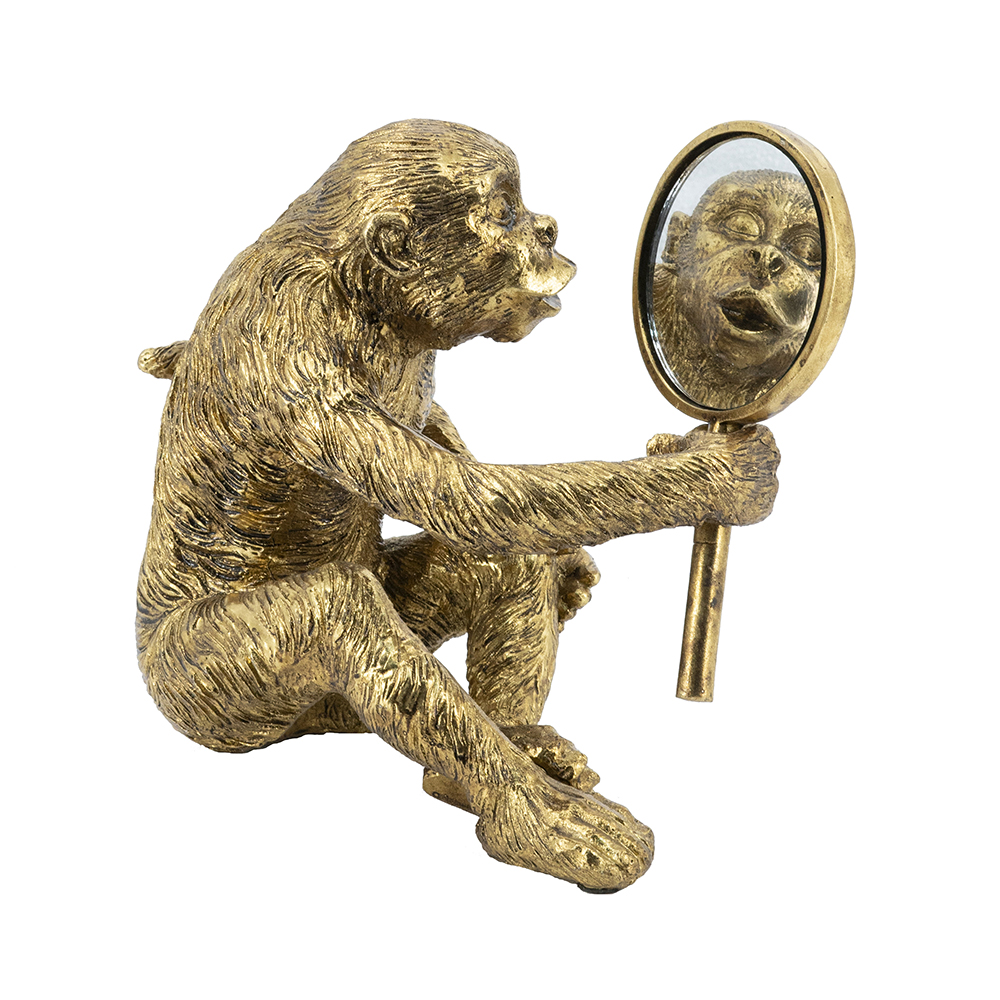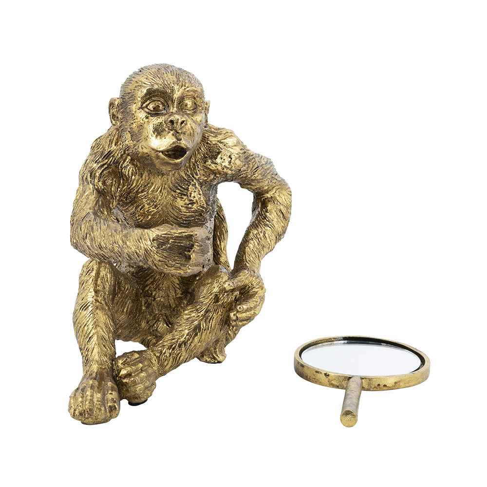 Infuse humor and style into your space with this handcrafted resin monkey sculpture, depicting a playful primate holding a round mirror to its ear like eavesdropping, in a gleaming gold finish. Measuring 9.5×6.5×10 inches, its detailed fur and cheeky expression add whimsical charm to shelves or desks. Perfect for homes or offices, this piece combines fun with elegance, ideal as decor or gift.