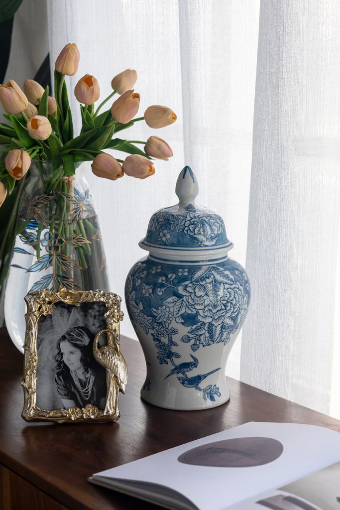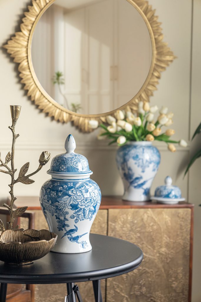 Masterfully crafted from 100% crisp porcelain, this ginger jar draws inspiration from Ming Dynasty designs to create a timeless home accent. Adorned with intricate blue and white floral and bird motifs, it is sure to elevate any space whether displayed alone or filled with a vibrant arrangement of fresh or faux blooms.