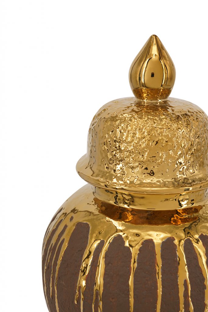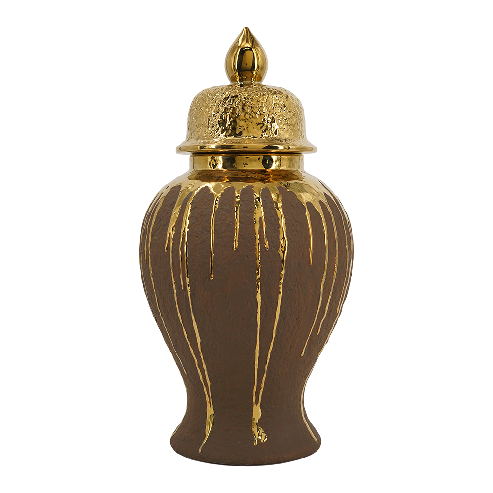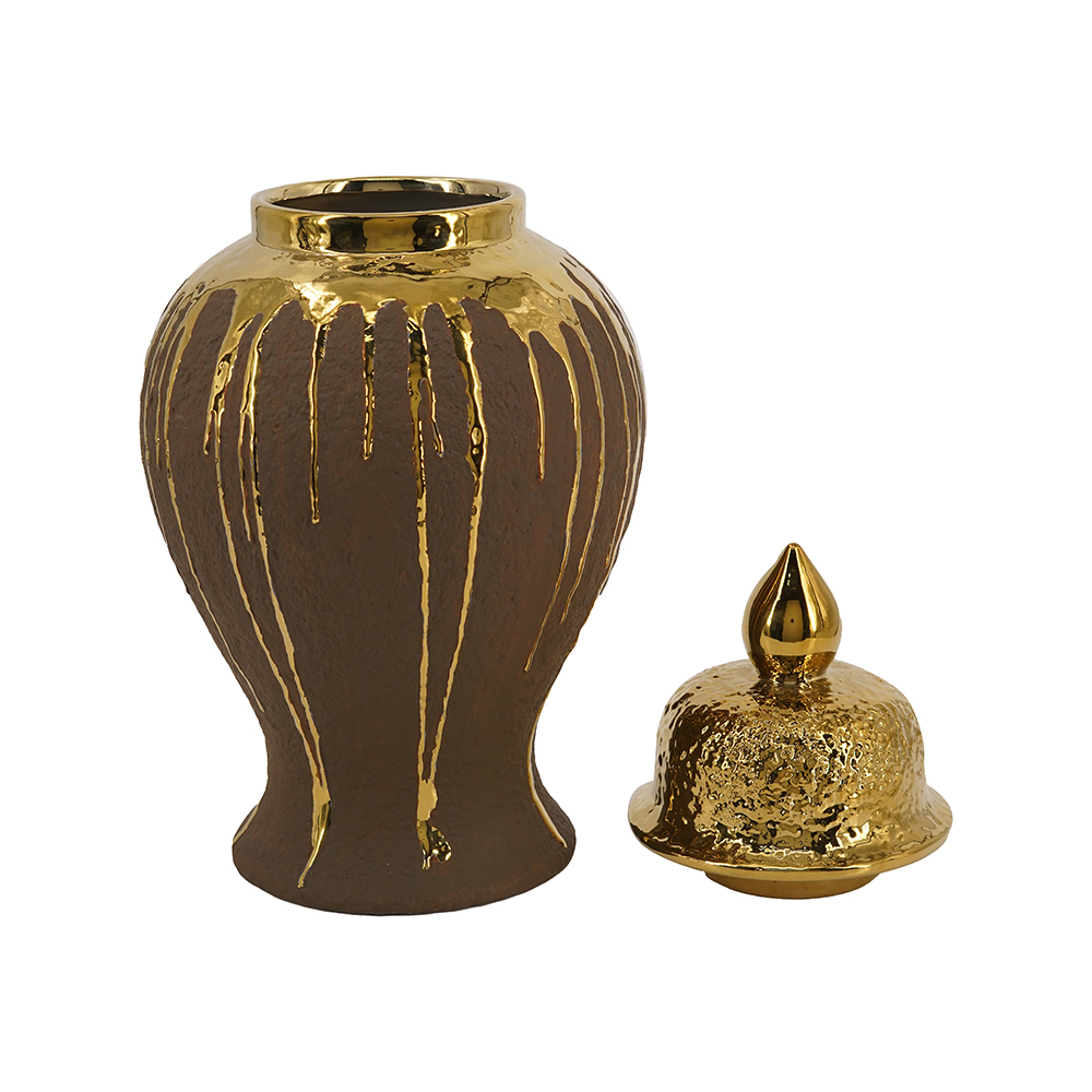 Add artistic luxury to your space with this ceramic ginger jar in deep brown, featuring dramatic gold drips cascading down the body for a molten, handcrafted effect. The textured gold lid with pointed finial enhances its classic urn shape, perfect for storing items, displaying flowers, or as a standalone. Blends rustic warmth with glam shine, ideal for boho, or contemporary interiors.