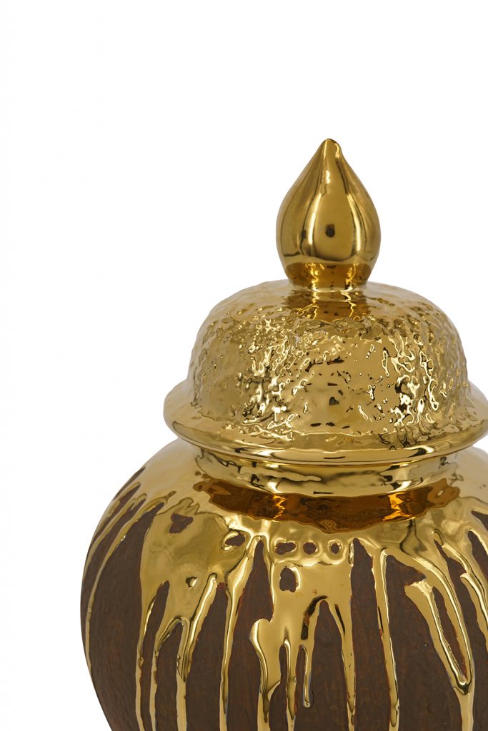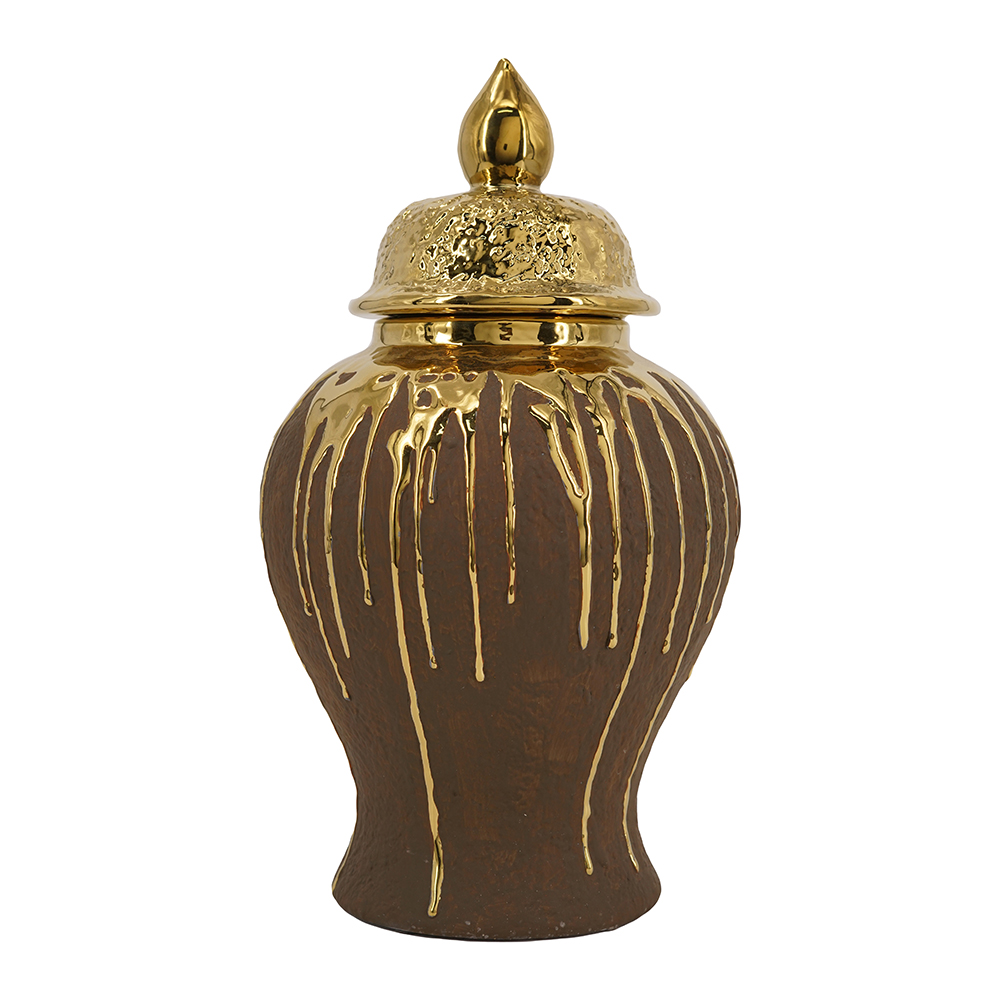 Add artistic luxury to your space with this ceramic ginger jar in deep brown, featuring dramatic gold drips cascading down the body for a molten, handcrafted effect. The textured gold lid with pointed finial enhances its classic urn shape, perfect for storing items, displaying flowers, or as a standalone. Blends rustic warmth with glam shine, ideal for boho, or contemporary interiors.