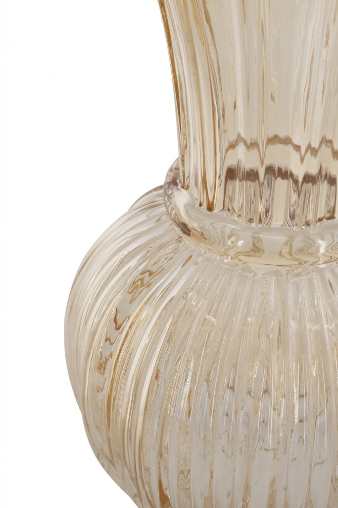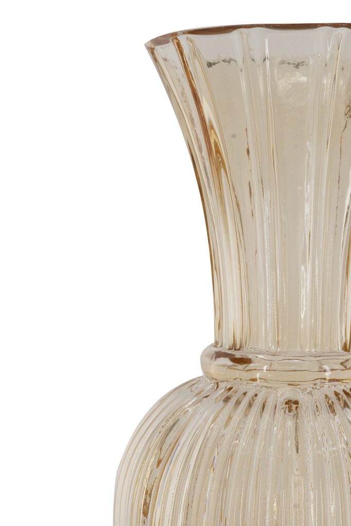 Capturing the understated beauty of mid-century modern design, this vase features a rounded silhouette, a dramatic flared neck, and a ribbed amber finish. Whether displayed alone or filled with fresh flowers, it effortlessly elevates any tabletop, mantel, or console.