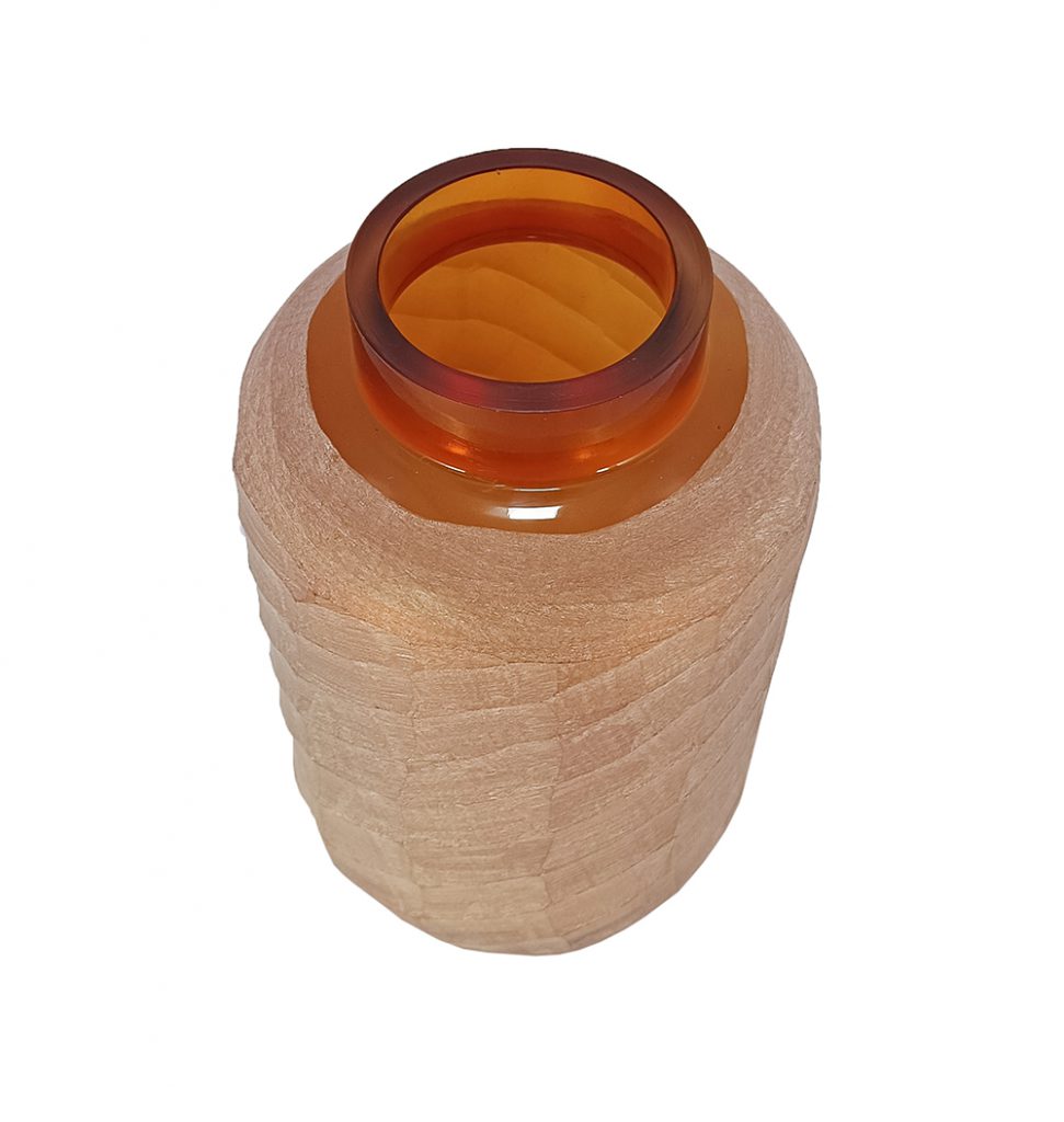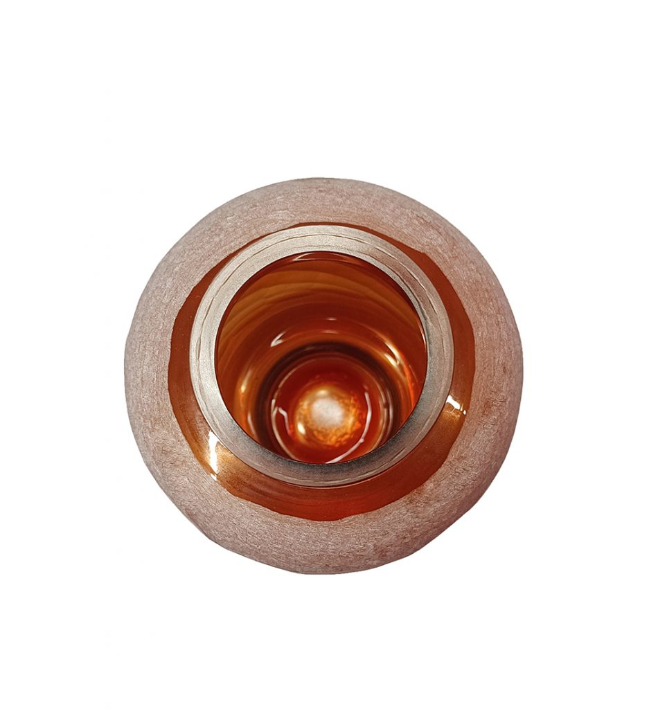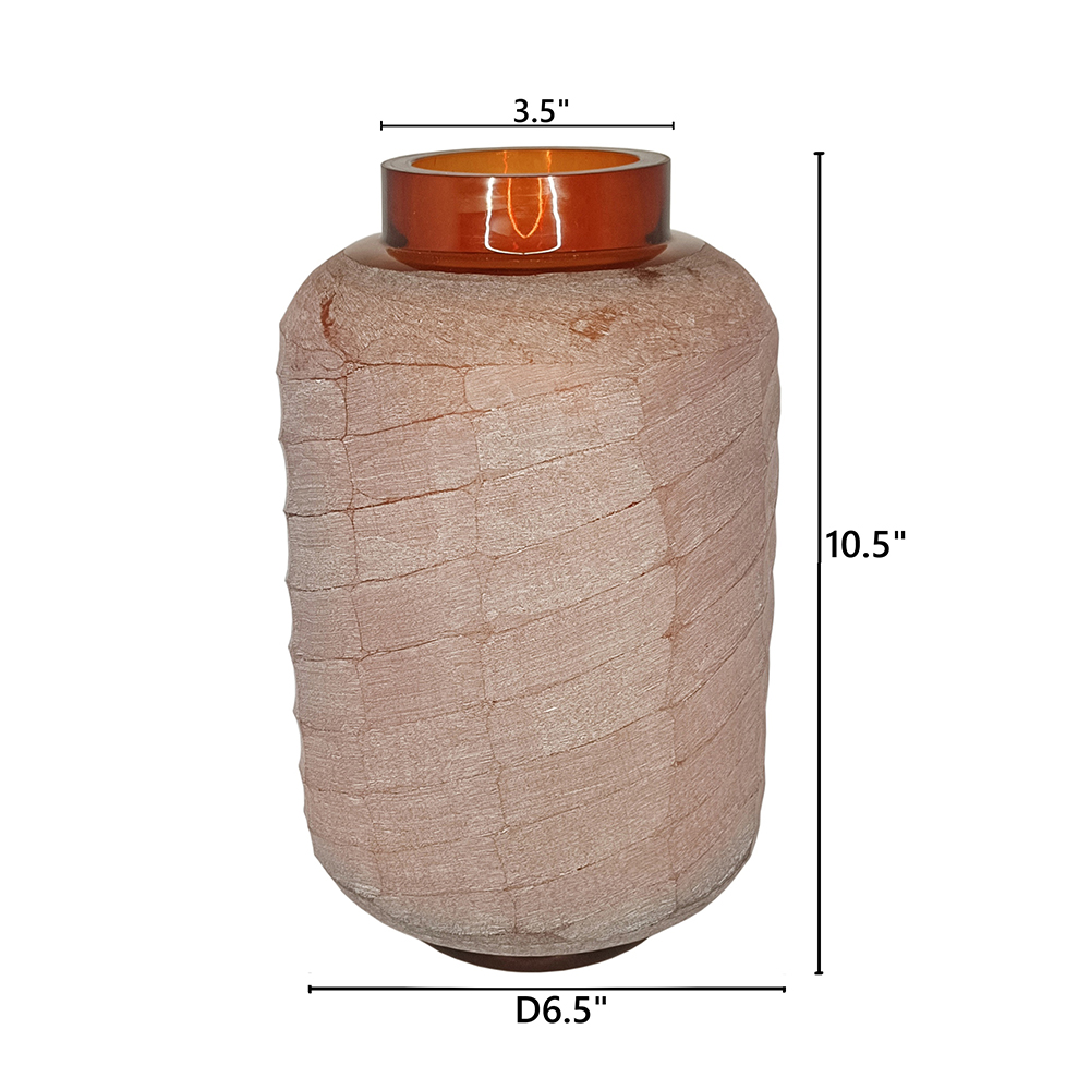 Bring organic elegance to your space with this frosted glass vase in soft blush terracotta, featuring a unique banded texture reminiscent of wrapped stone or cracked earth for artistic depth. The warm amber rim adds a contrasting glow, perfect for fresh blooms, dried stems, or as a standalone item. Suits boho, or rustic decor on mantels, tables, or entryways with subtle shimmer and warmth.