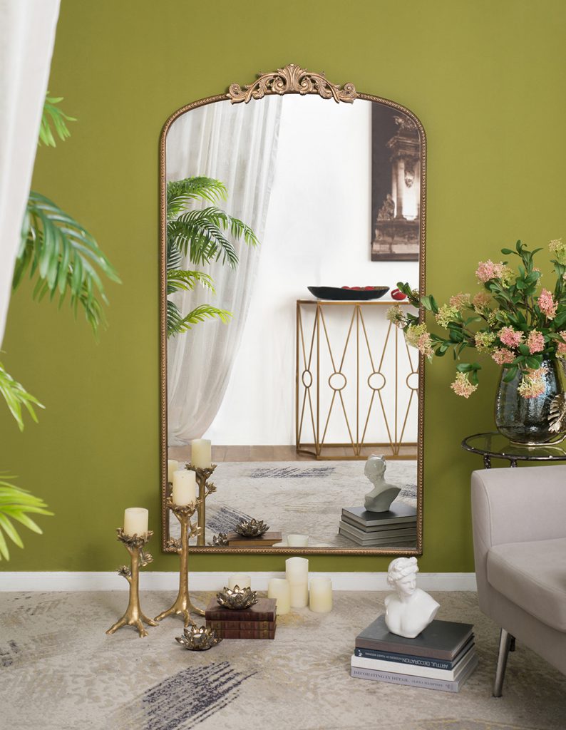 Boasting a grand arched silhouette, a smooth golden frame, and an intricately crafted regal adornment at the head, this full-length mirror blends classic baroque style with versatile function. Measuring a large 66H x 36W x 2D, it will capture your whole reflection with ease while also elevating the decor in your living room or bedroom.