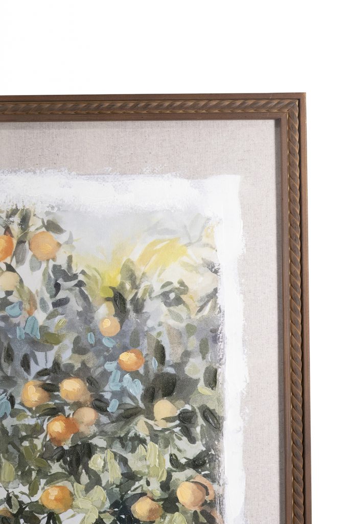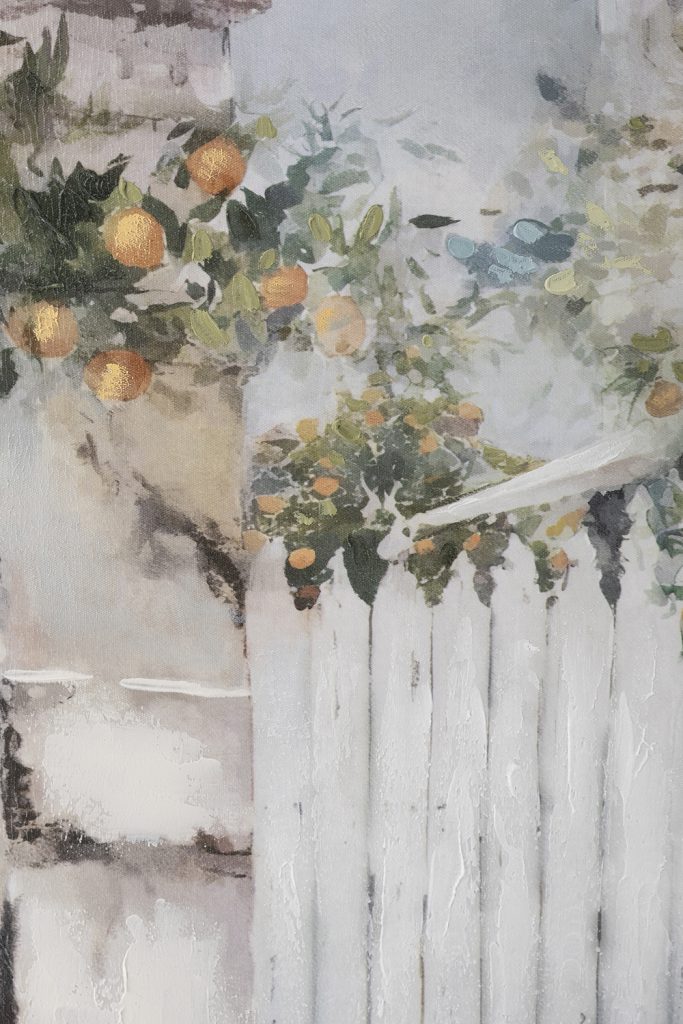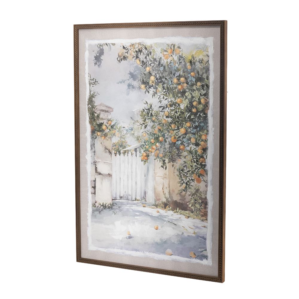 Capturing the cozy beauty of sunlit Tuscany in delicate, hand-painted brushstrokes, this canvas art showcases a tranquil garden passage with a rustic white gate and sprawling orange grove. Framed in textured pine wood, it makes for a striking addition to any gallery wall.